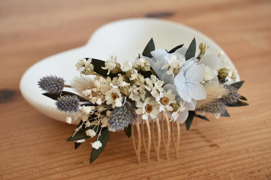 Pale blue hydrangea and daisy floral comb