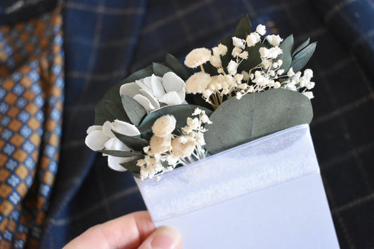 White hydrangea and eucalyptus pocket boutonniere