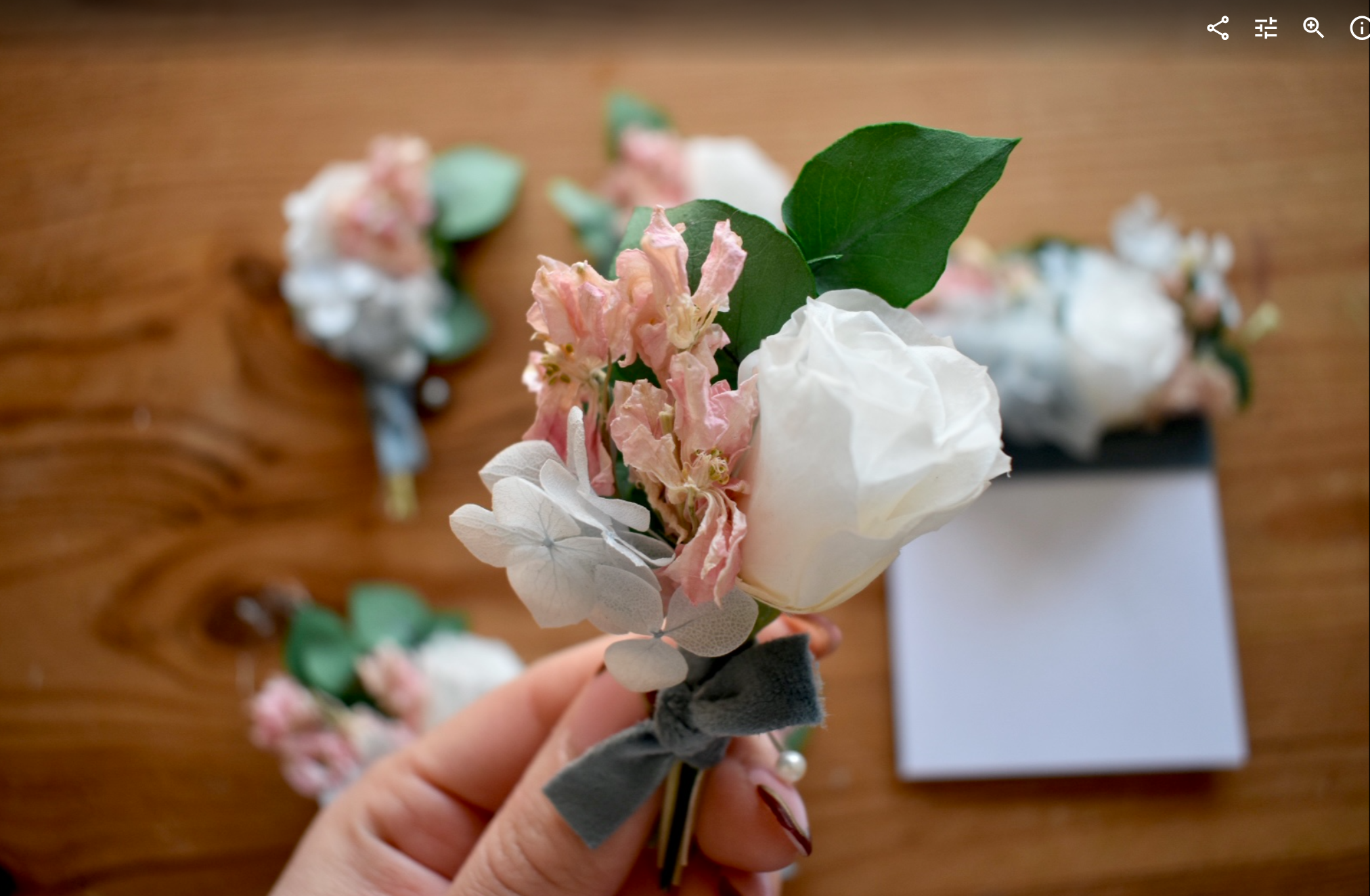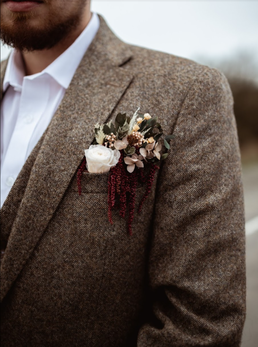 Whether you’re after a classic boutonniere or something more modern, I’ve got you covered. My pocket boutonnieres are a sleek, pin-free option that simply slip into your suit pocket—stylish, secure, and hassle-free. For corsages, there’s something for everyone: choose from wrist corsages, bag corsages, or timeless pin-on styles. Each piece is made to complement your colour scheme and overall wedding vibe, bringing those little details together beautifully.