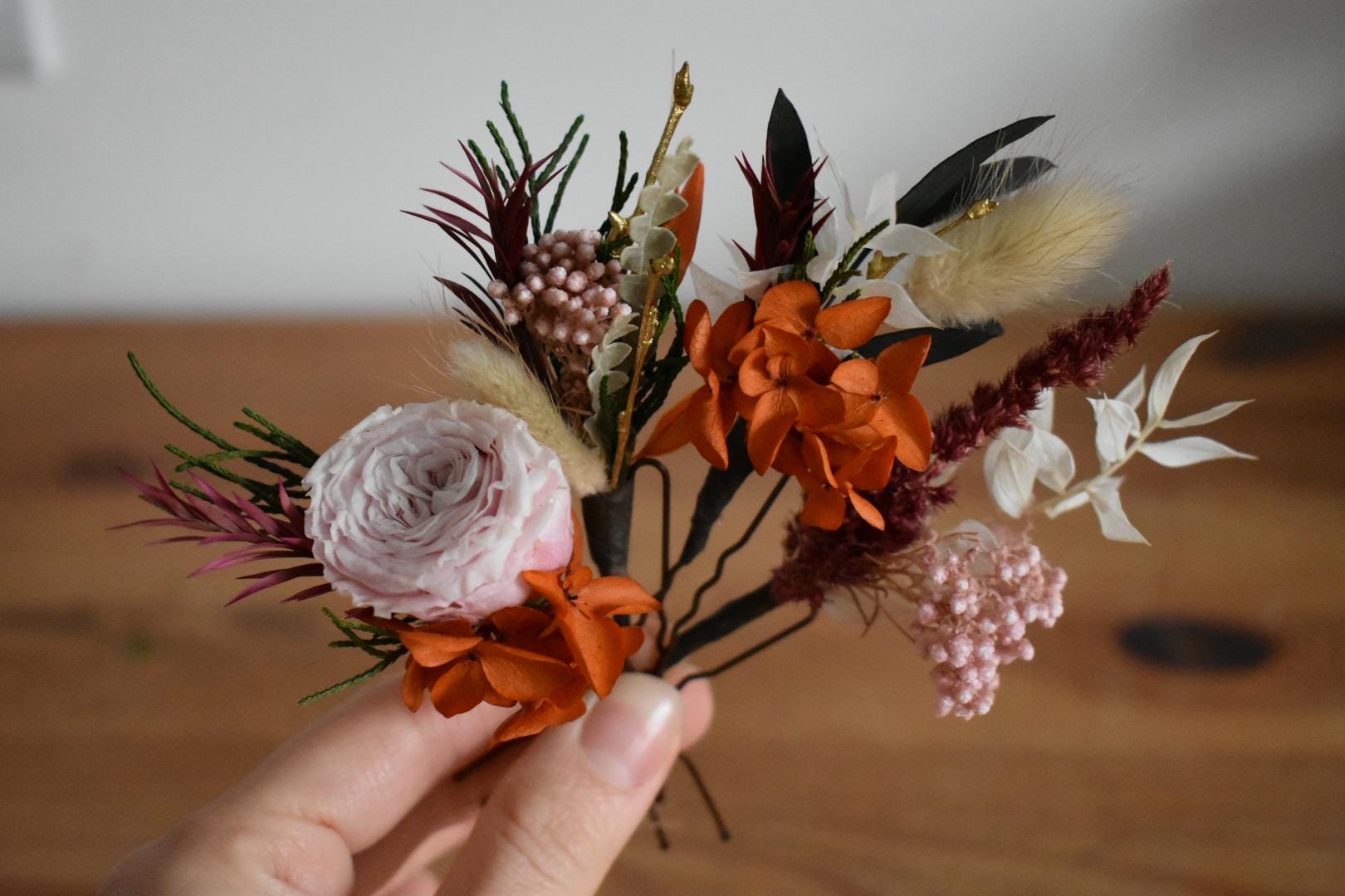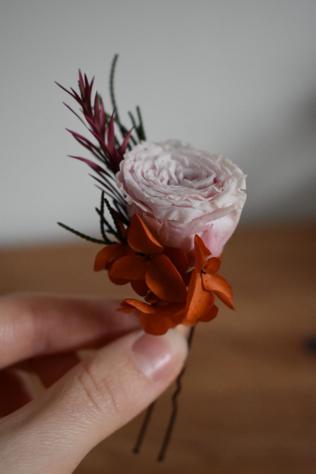 Set of 4 hair pins made with preserved foliage, hydrangea and a pale pink rose.
