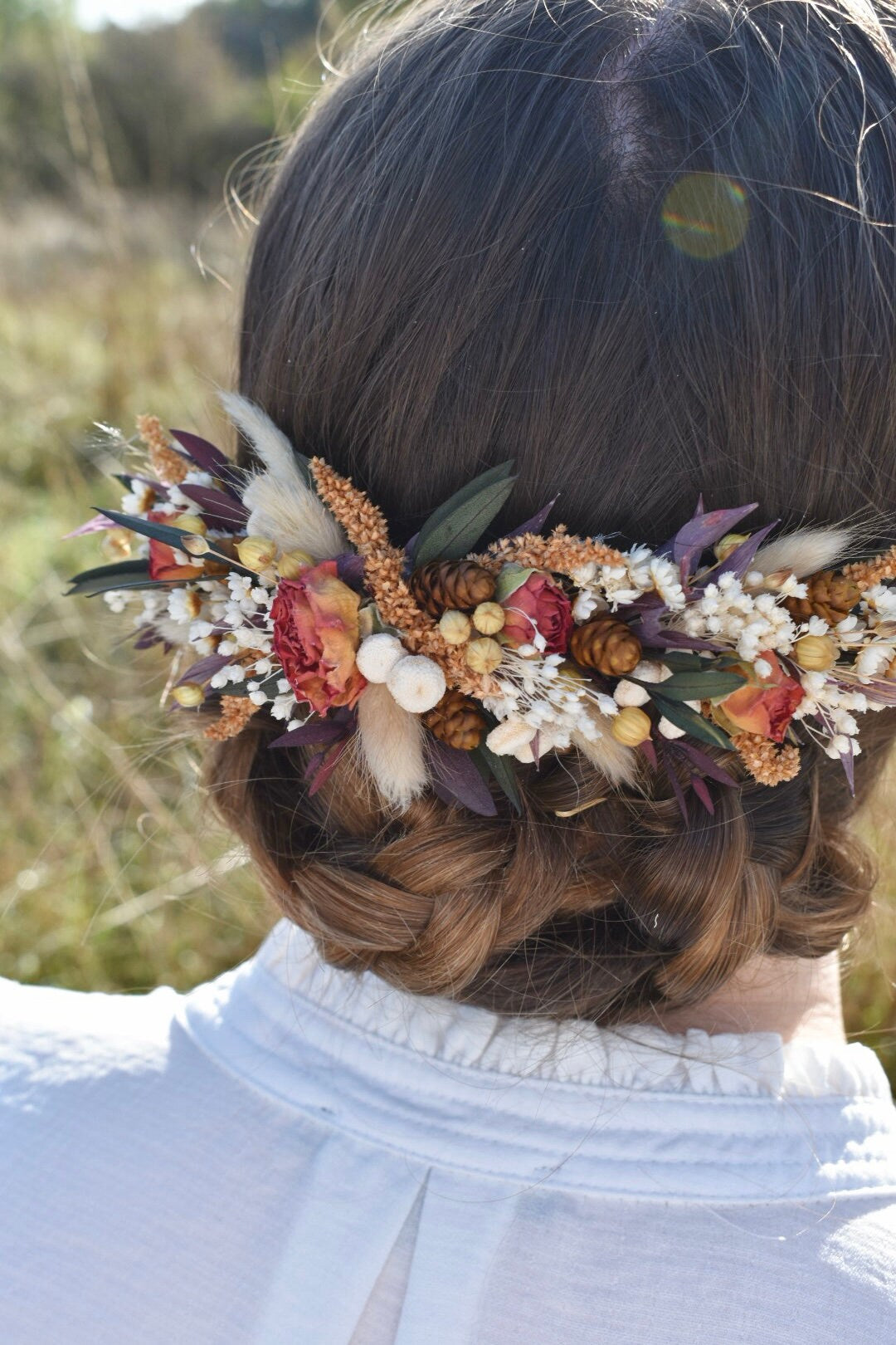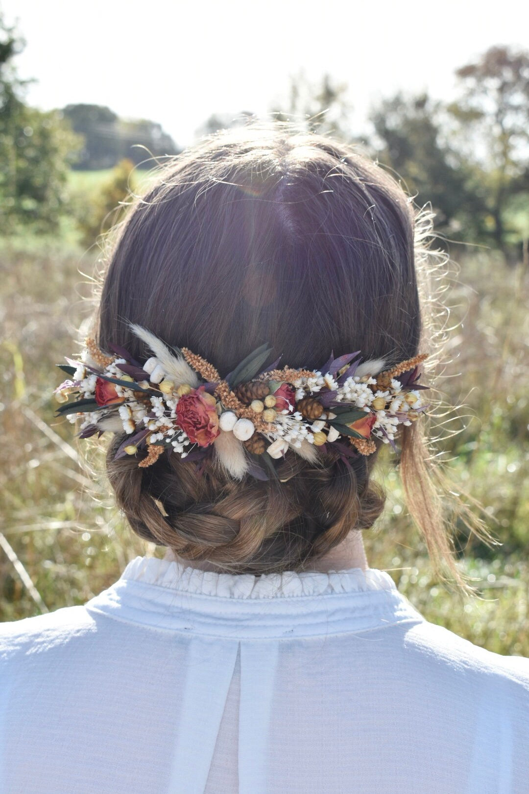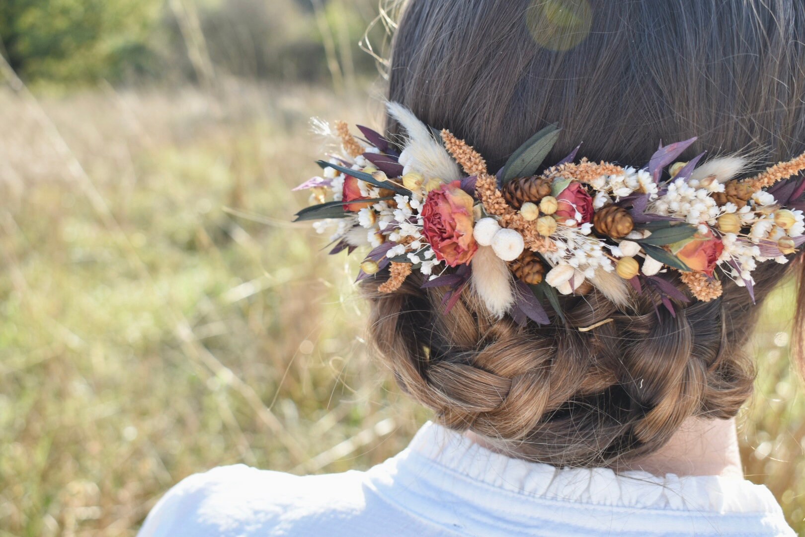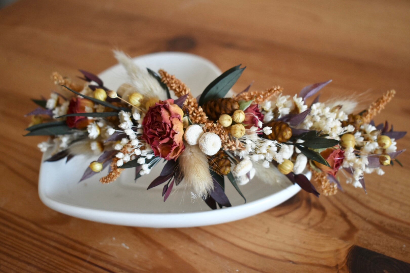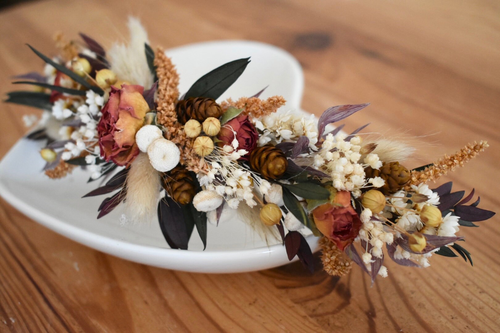 This floral hair piece is an arrangement of preserved and dried flowers including eucalyptus, bunny tails and roses.