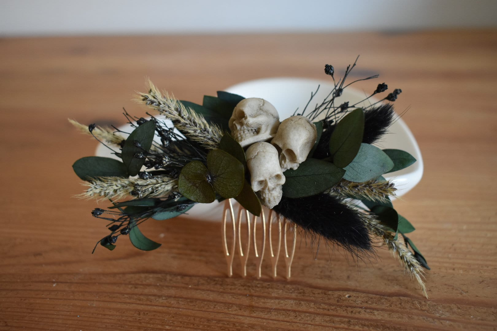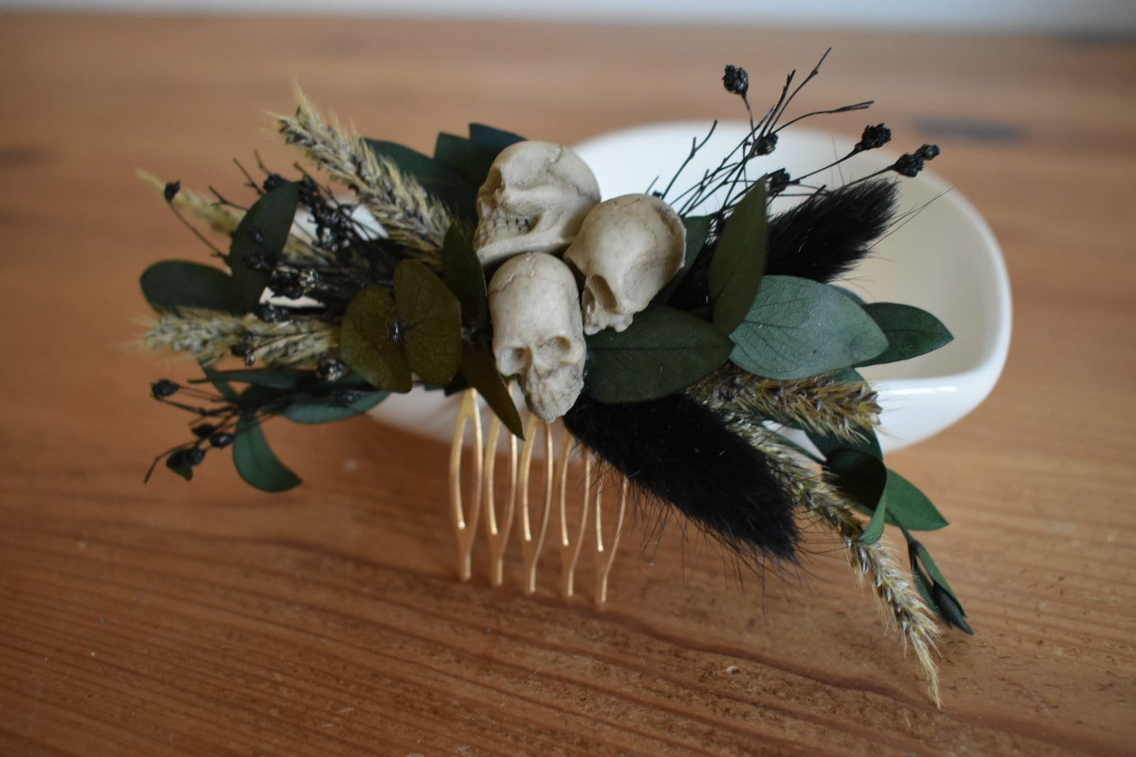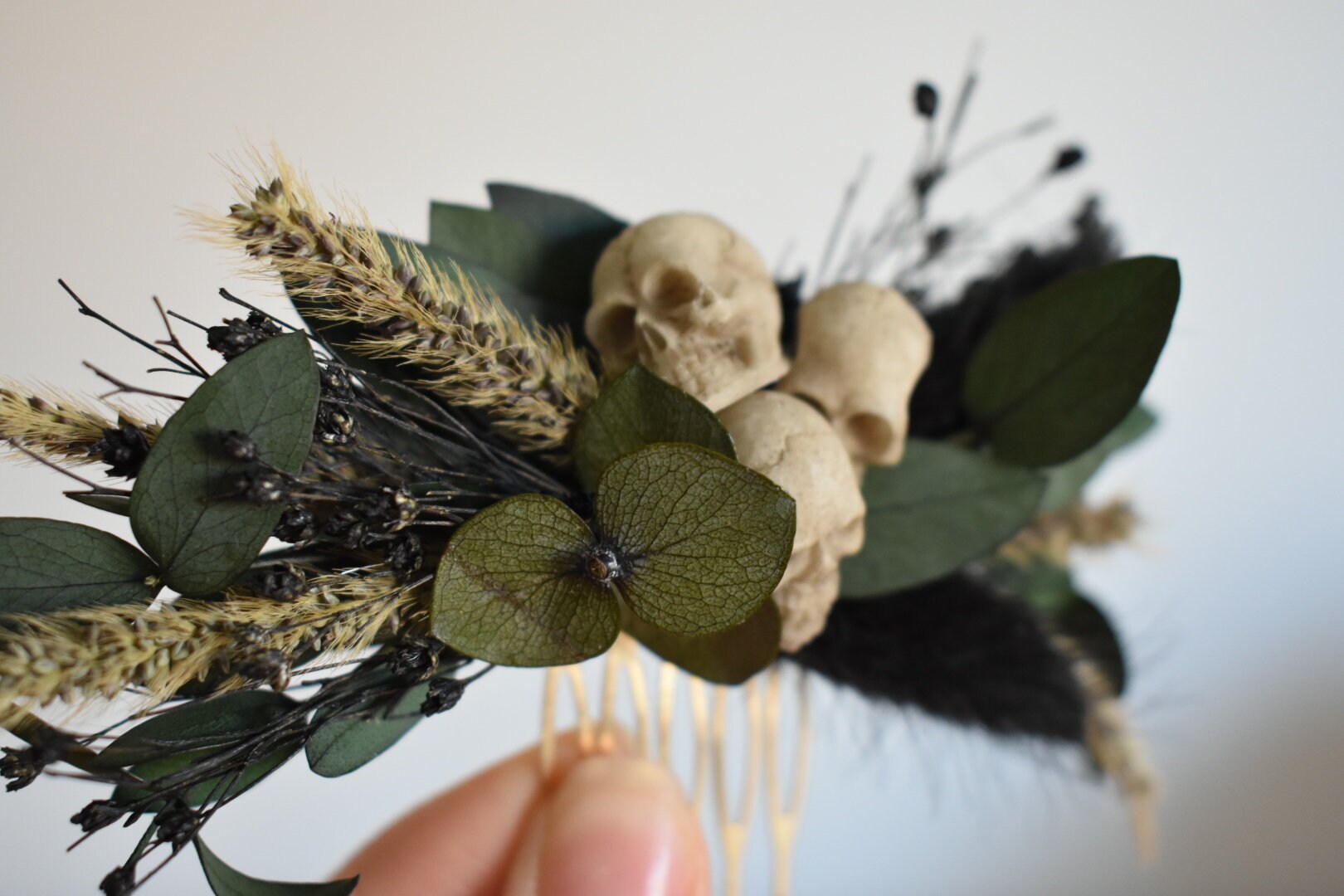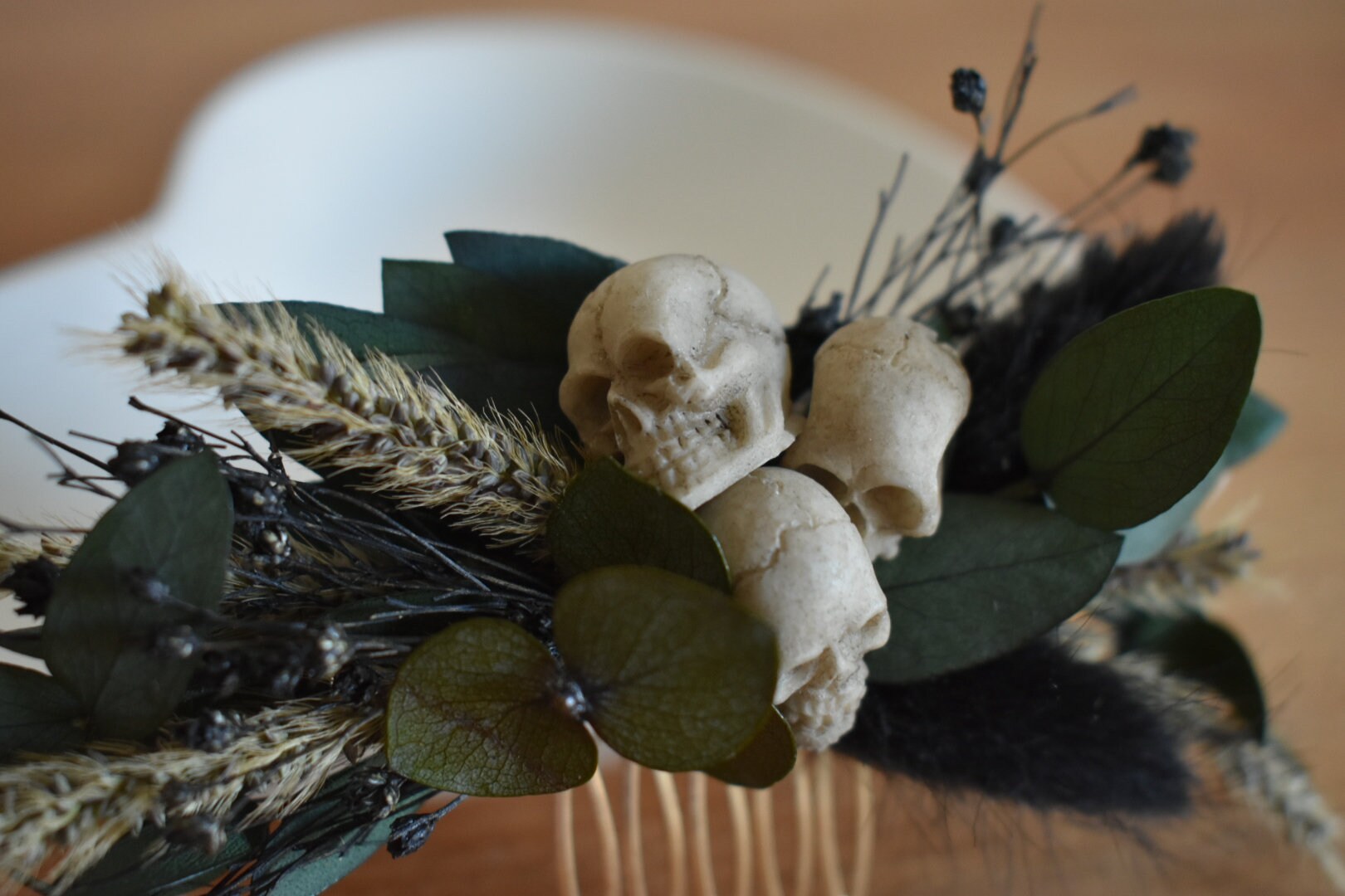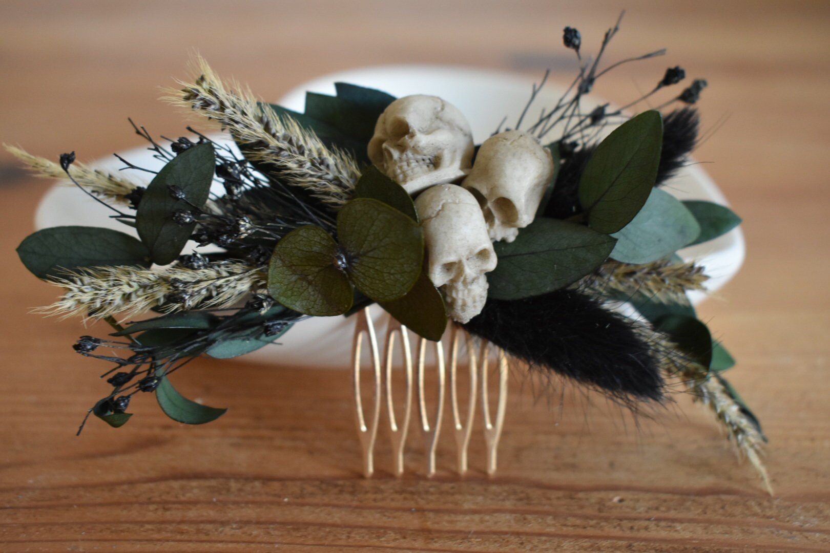 Floral hair comb made with preserved eucalyptus leaves, dried green and black foliage and mini faux skulls.