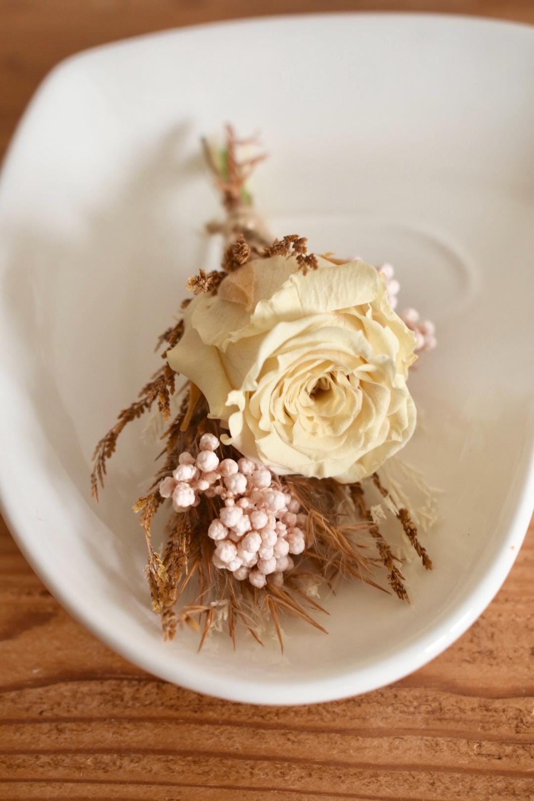 This buttonhole has been created using a preserved rose, nude rice flower and a mix of dried grasses. The stems are wrapped in twine for a rustic finish and is supplied with a faux pearl-topped pin for easy attachment.
