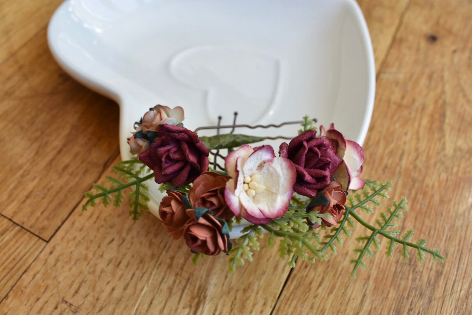 A set of small floral hair pins with sprigs of greenery and paper flowers in burnt orange, champagne and burgundy.