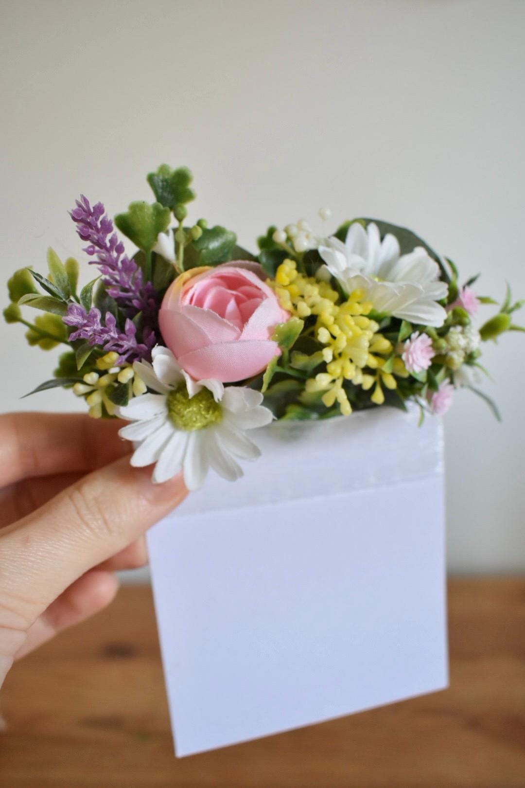 This pocket-style artificial boutonniere is designed to slip effortlessly into a suit pocket—no pins needed. It features a mixture of summer flowers and leaves.