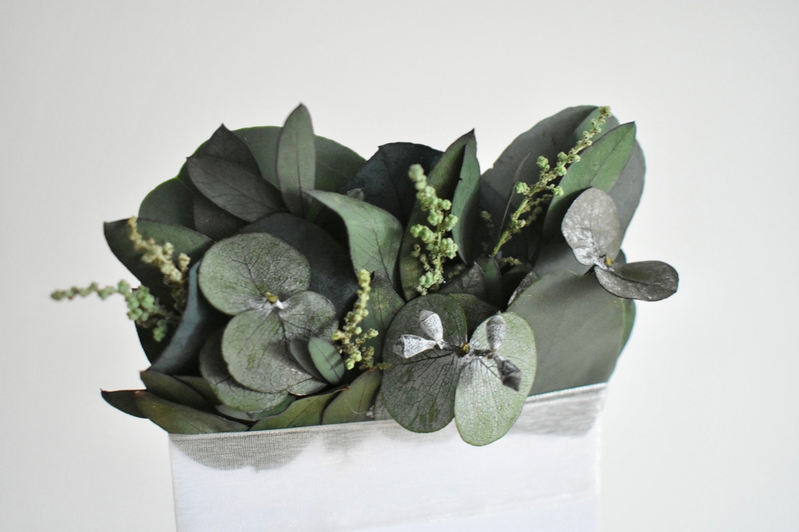 Floral pocket square with real preserved eucalyptus, attached to white card and finished with an white organza ribbon.