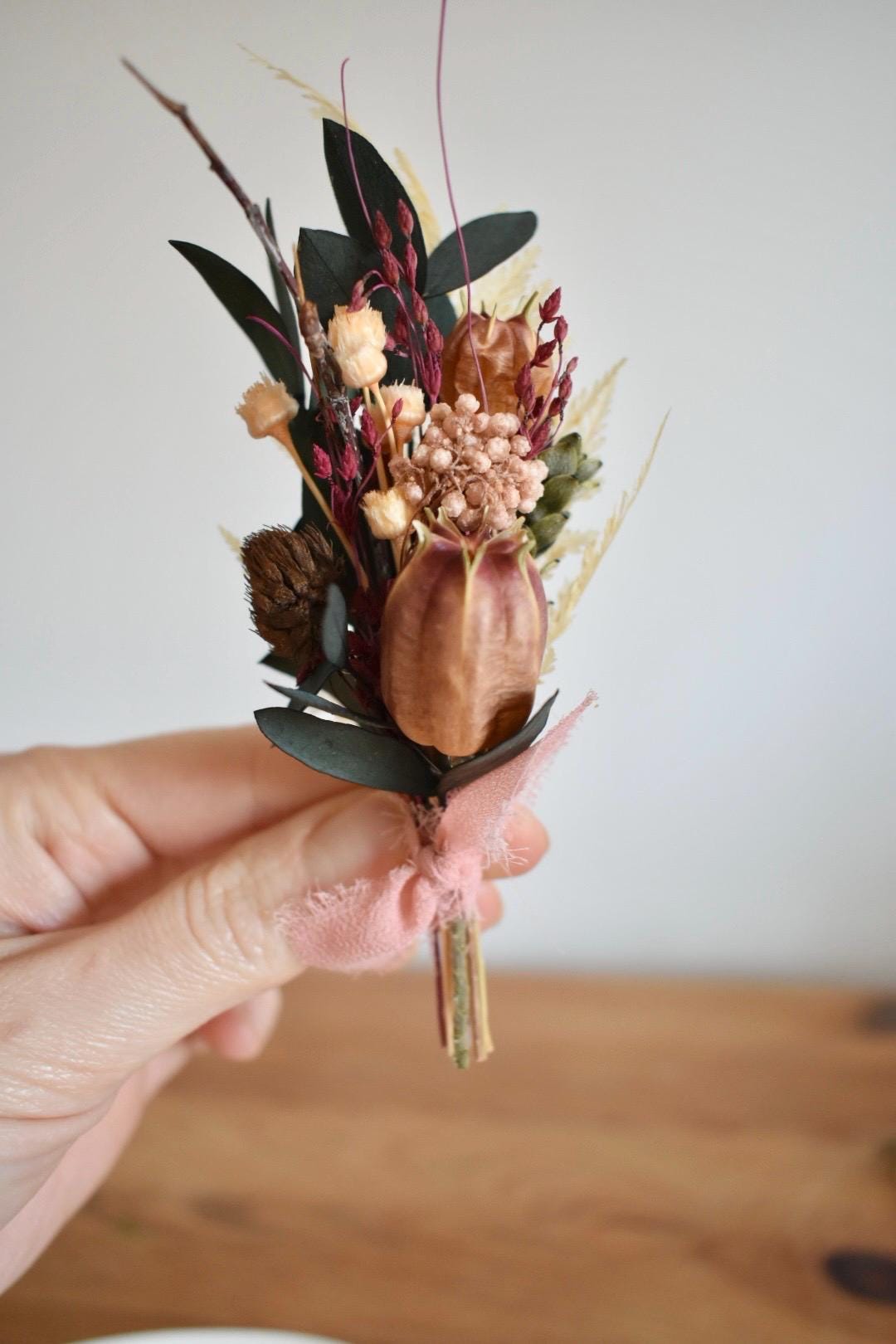 This dried flower buttonhole has been created using preserved eucalyptus, nude rice flower, dried nigella pods and other foliage. The stems are wrapped in a pale pink chiffon ribbon and supplied with a faux pearl-topped pin for easy attachment.