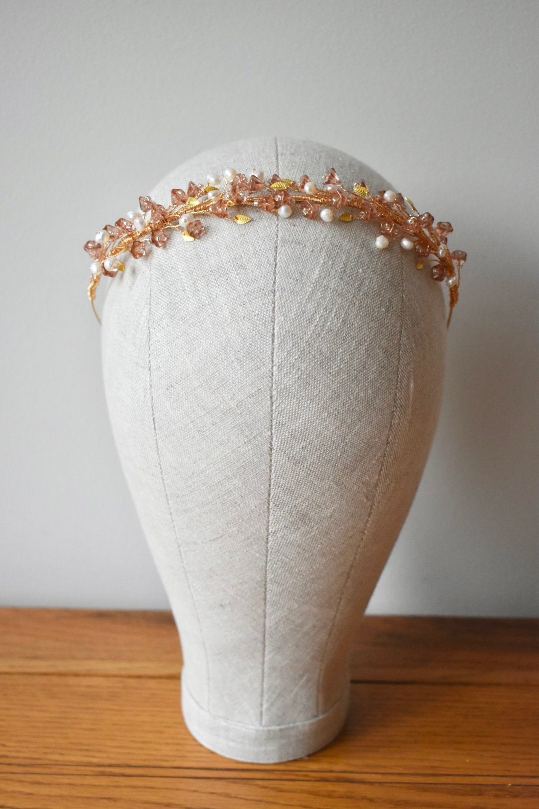 Delicate headband made with Czech glass flowers beads in blush, freshwater pearls and small gold leaves attached to a gold toned headband with wire.
