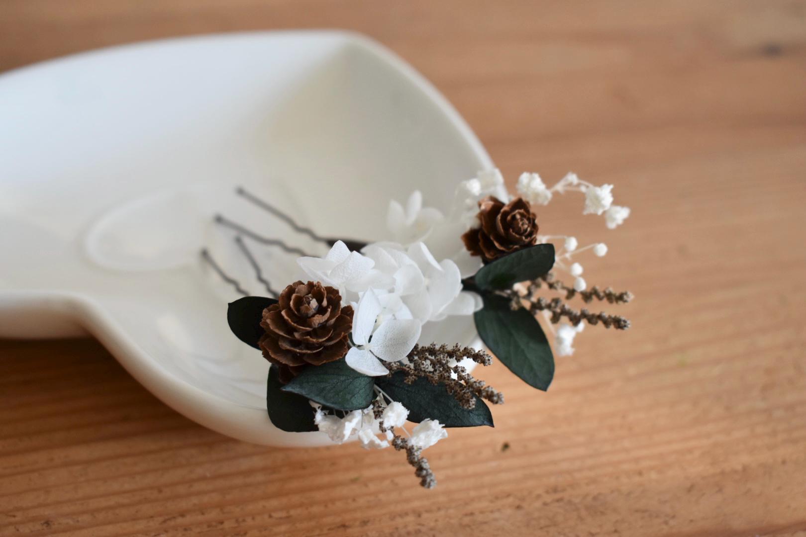 Floral hair pins with preserved hydrangea, eucalyptus gypsophila and mini pine cones.