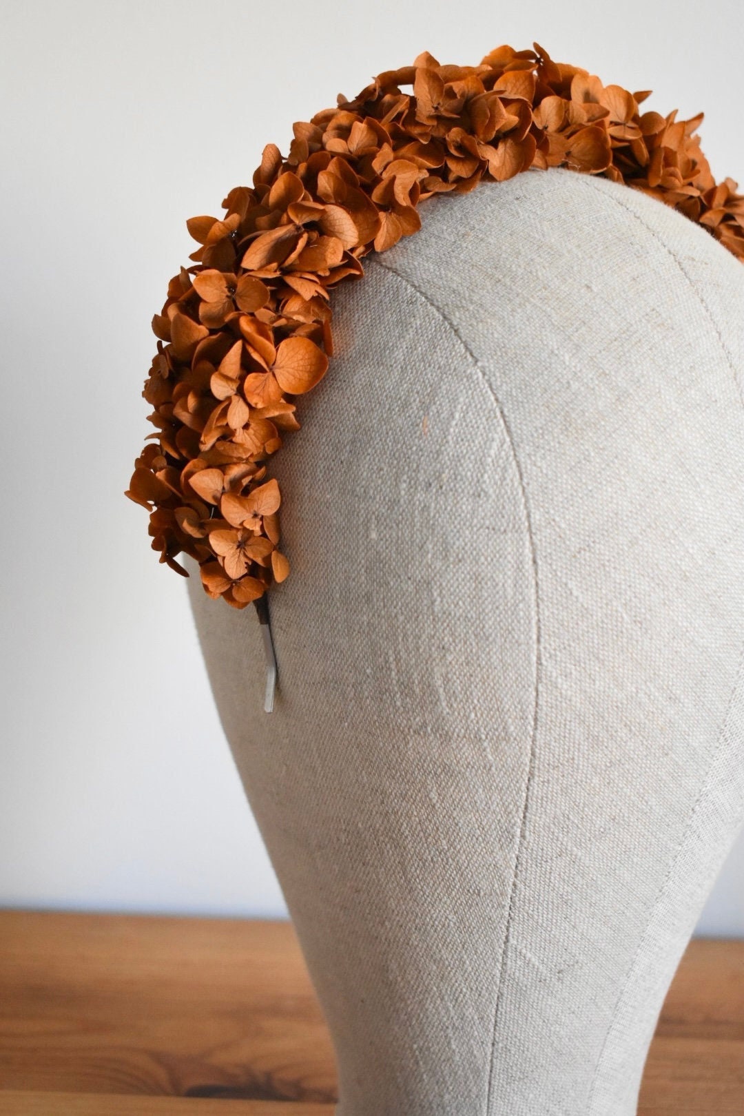 Dried hydrangeas in deep orange attached to a metal silver headband.