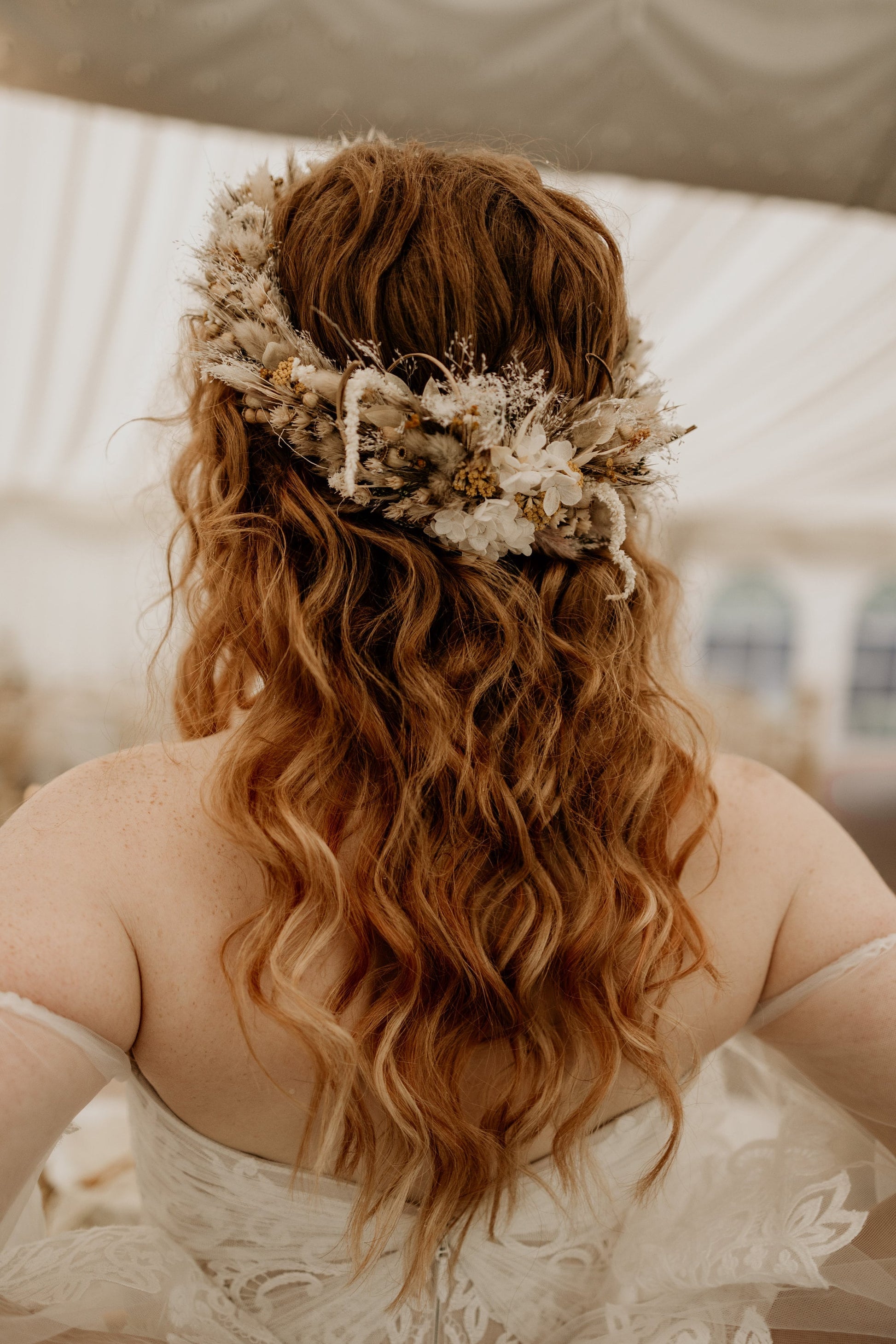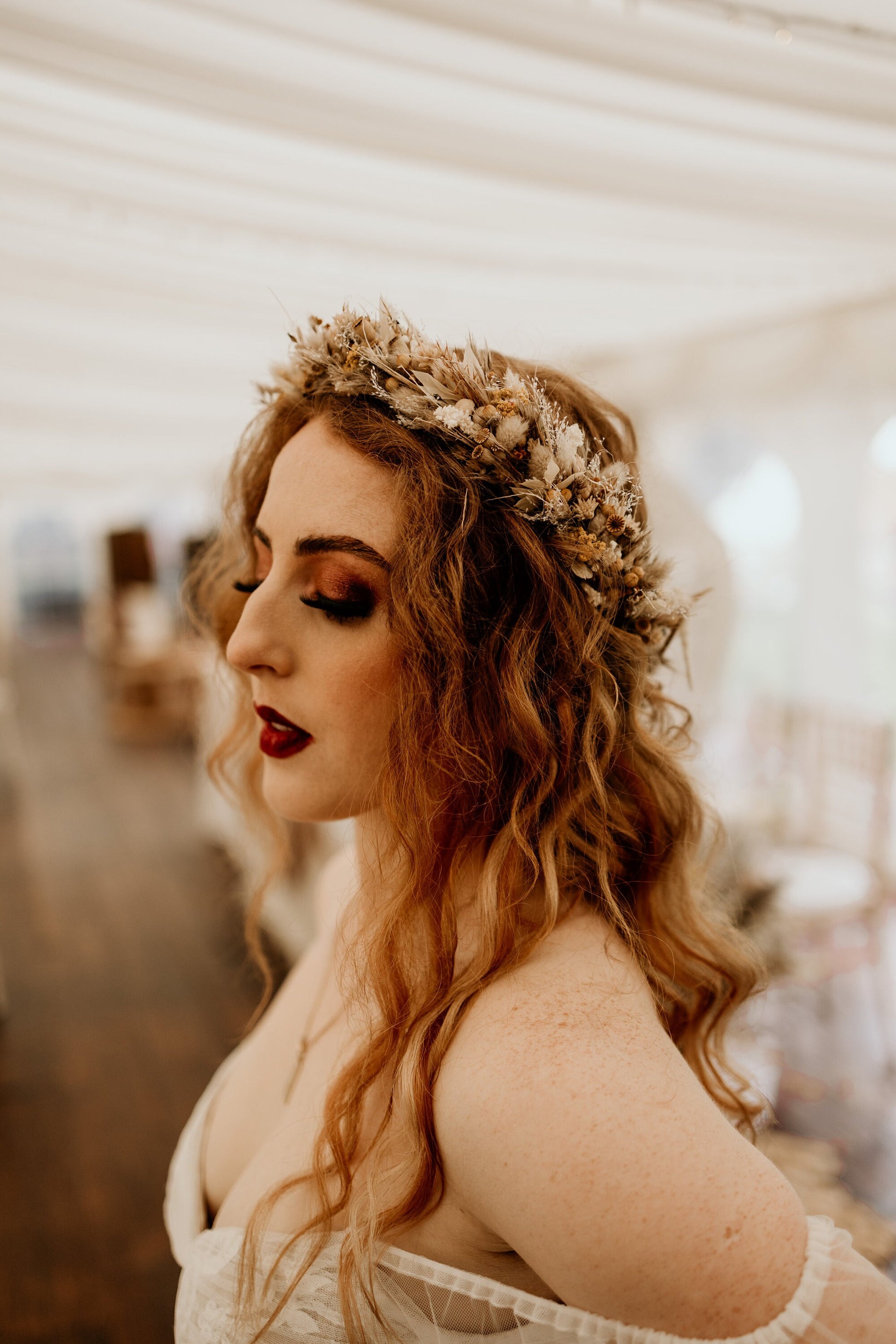 Full floral crown made with dried and preserved flowers in natural shades of ivory, brown and yellow. Flowers include hydrangea, various grasses including pampas, bunny tails, yarrow, poppy seed heads and amaranthus.