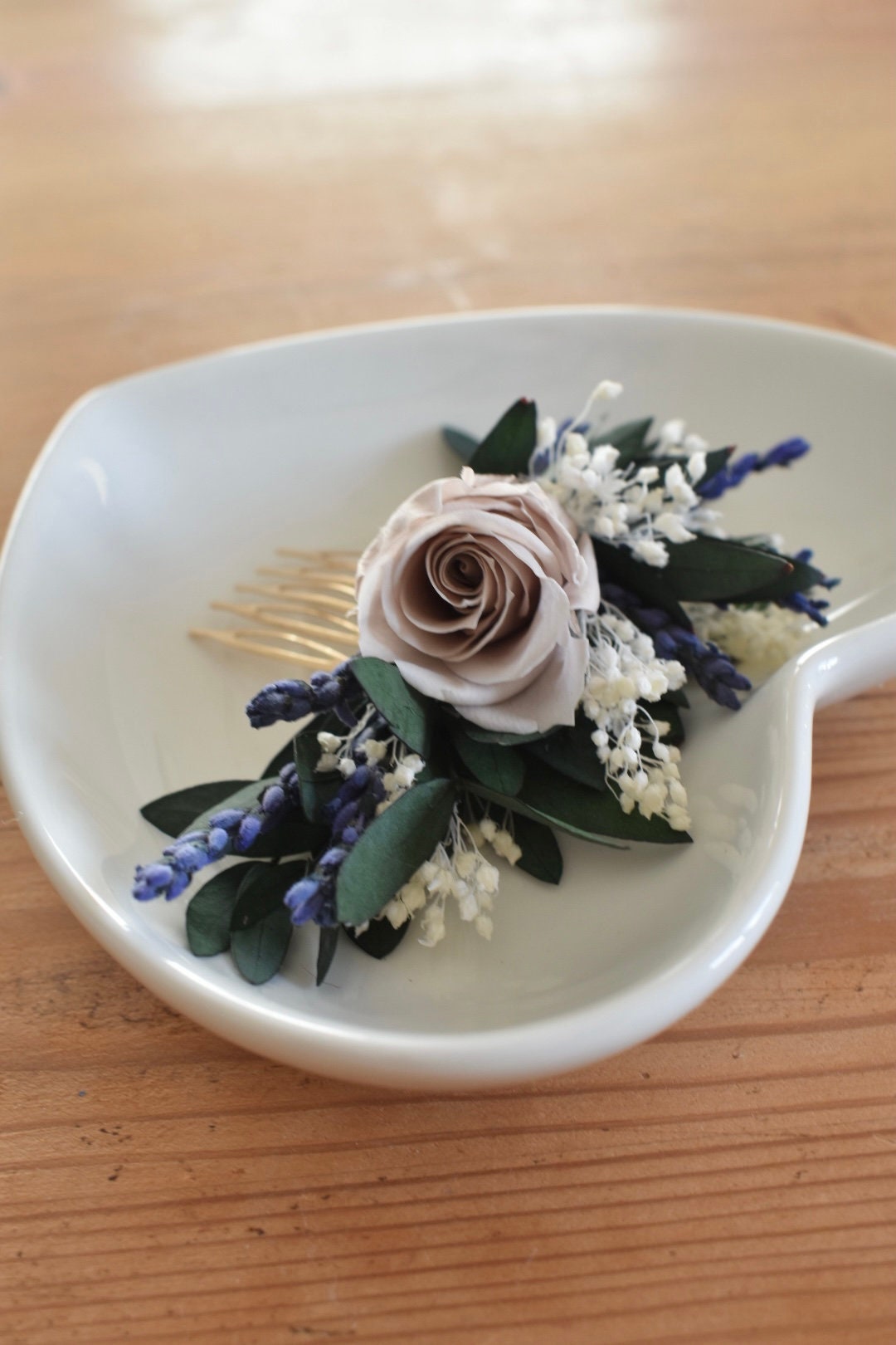 Floral hair comb made with a preserved rose, eucalyptus, lavender and dried broom bloom.