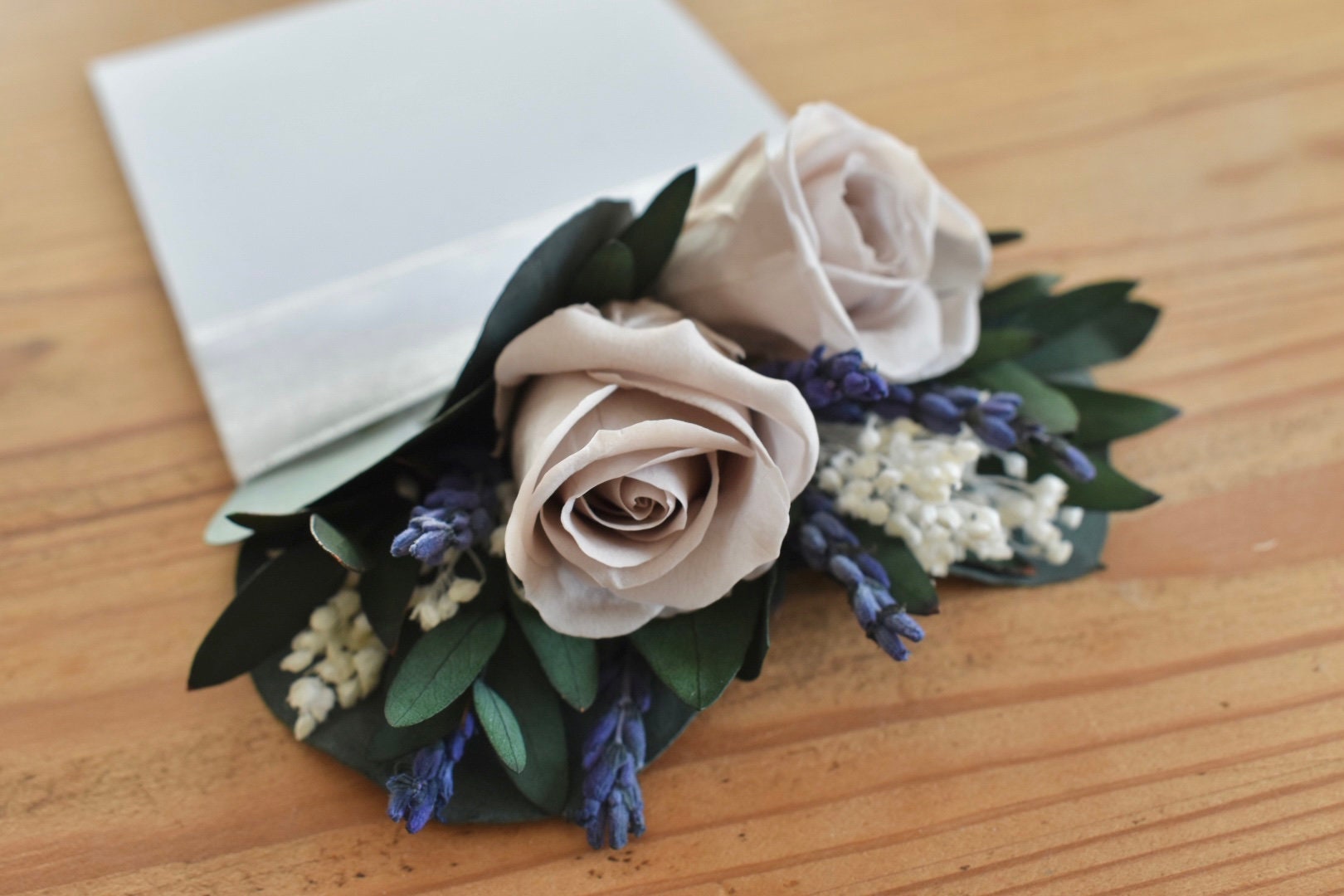 Floral pocket boutonniere made with preserved eucalyptus, roses, lavender and dried broom bloom.