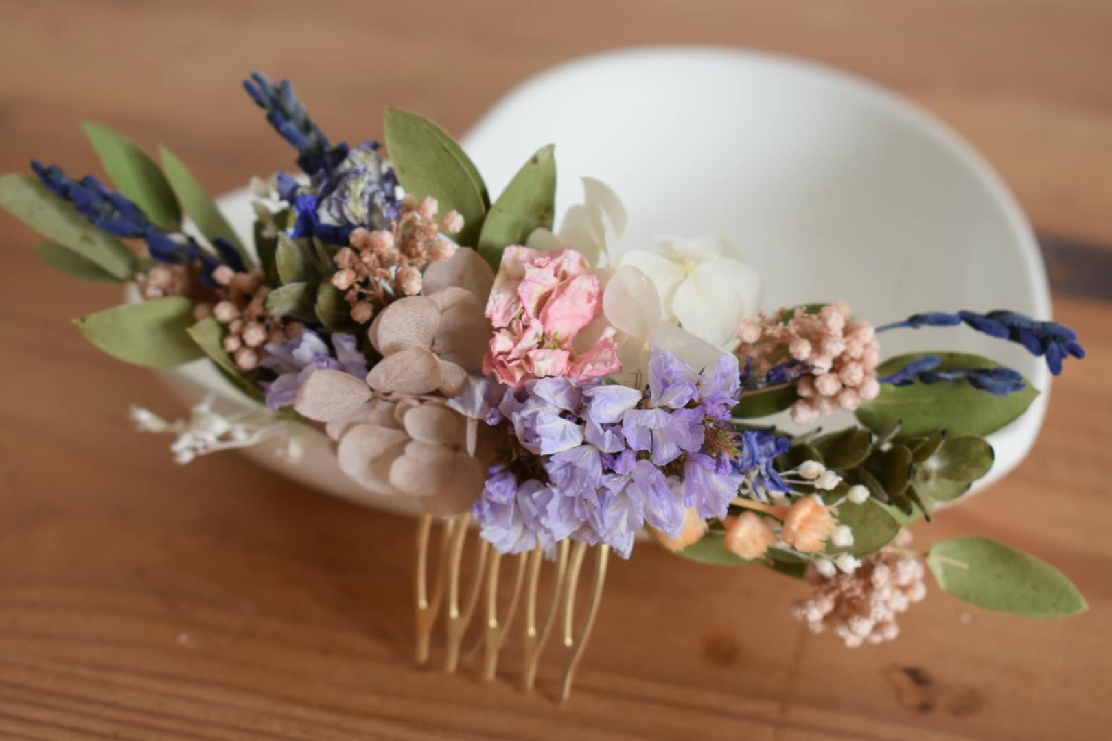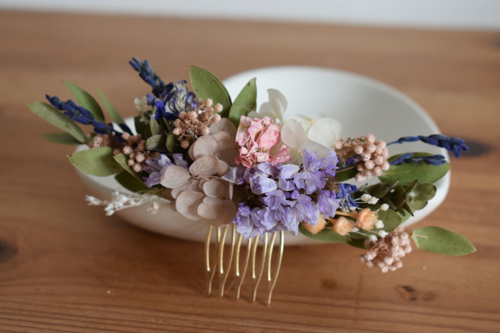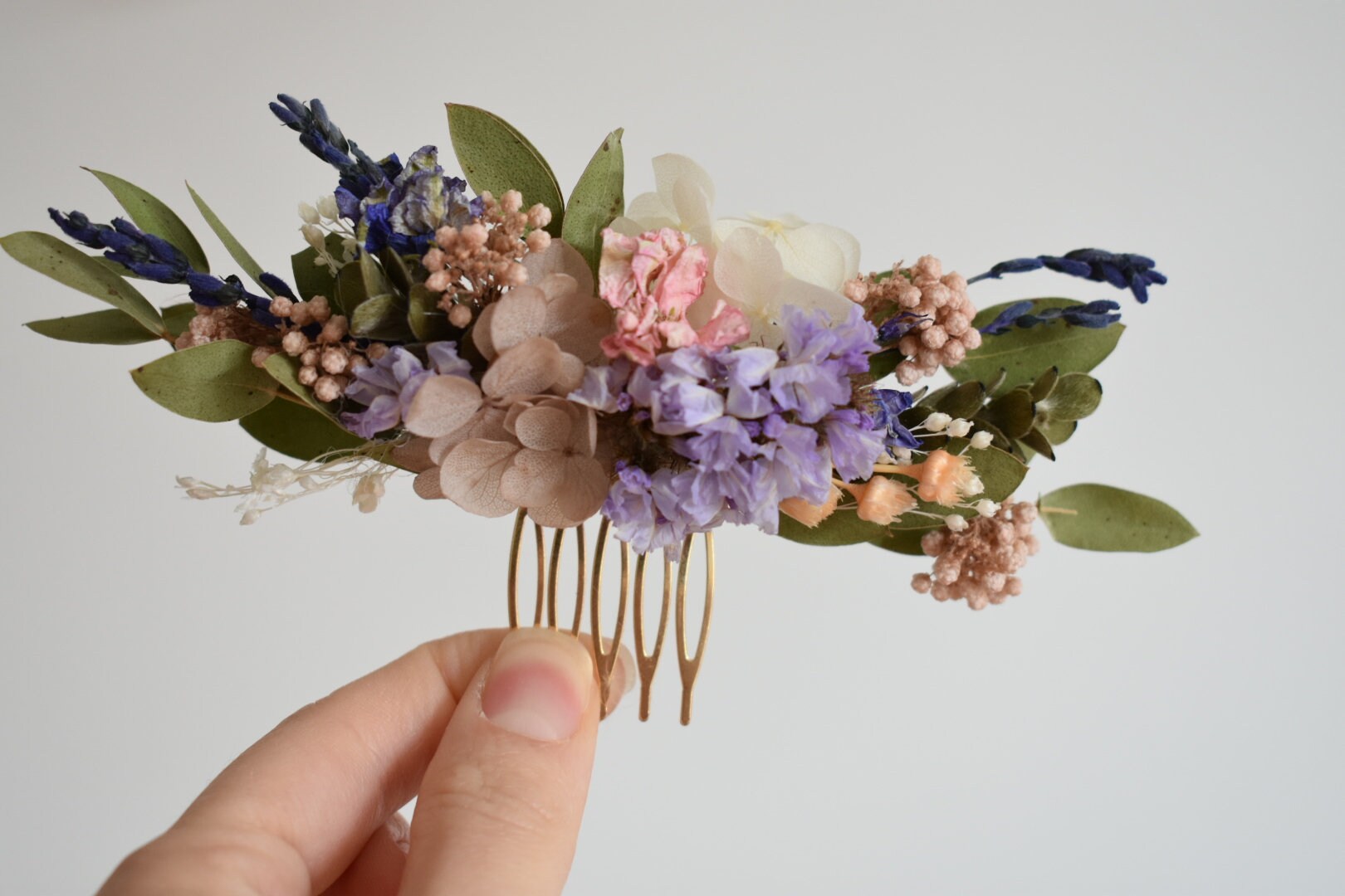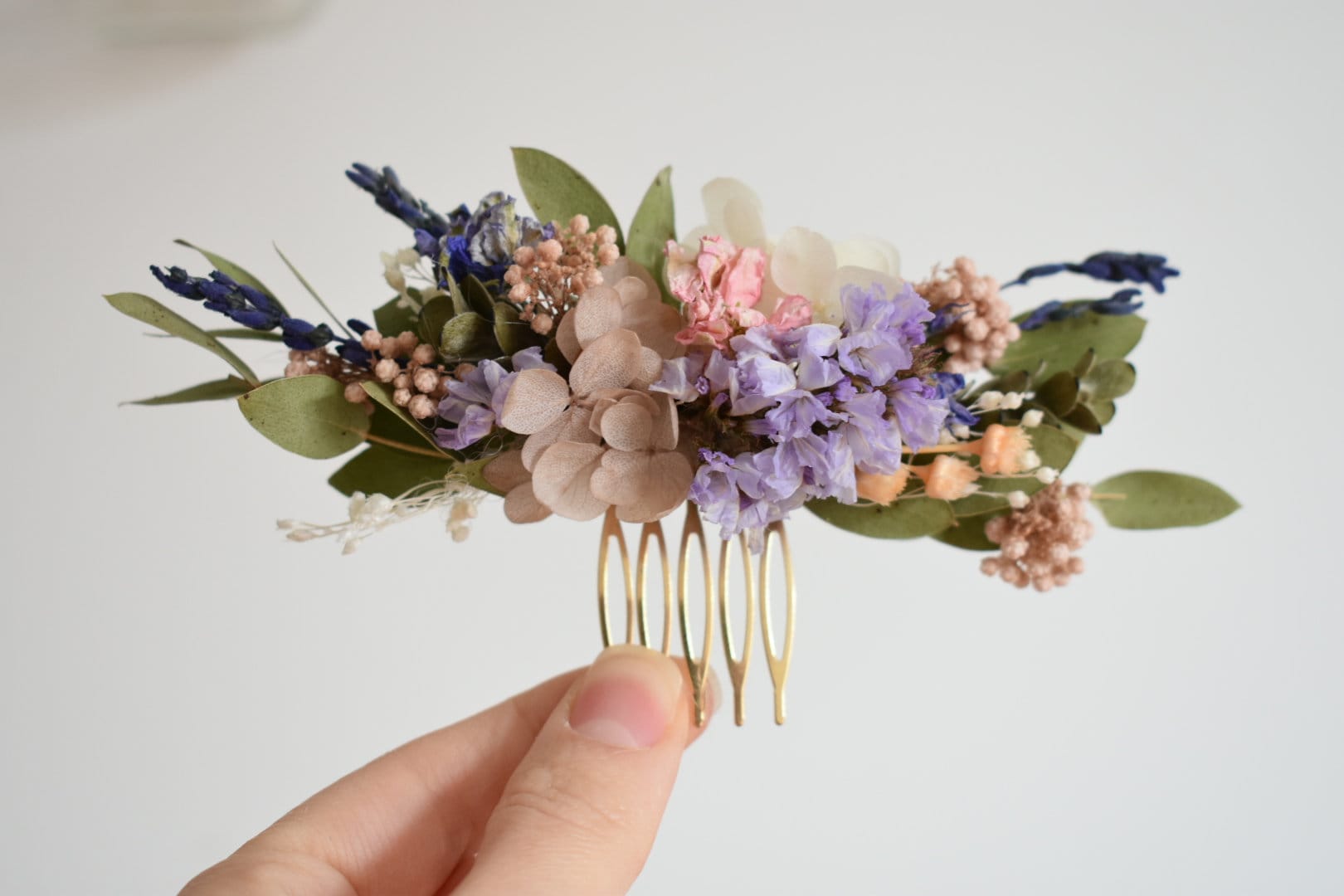 Flower hair comb with a mixture of dried spring flowers and foliage.