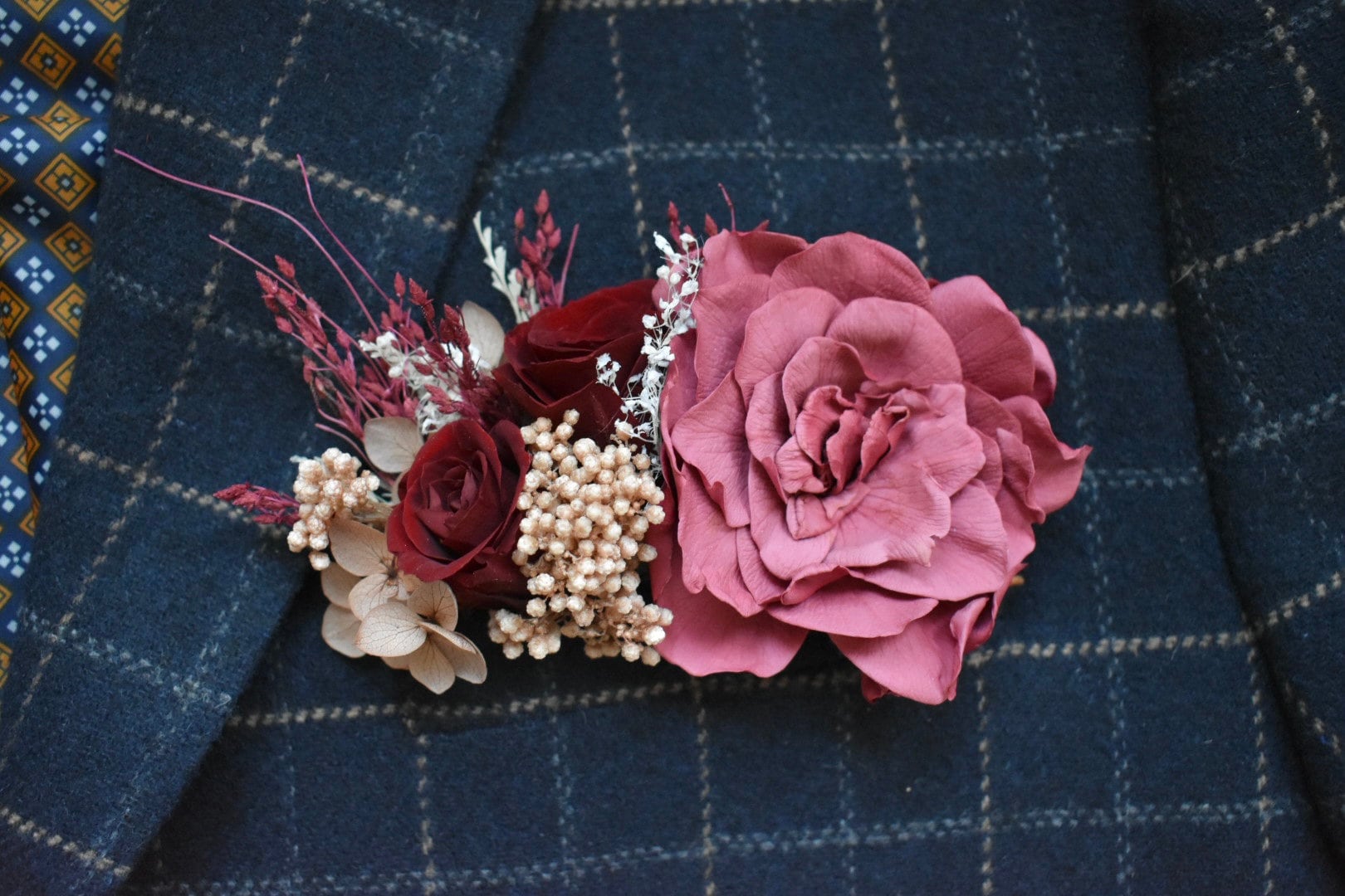 Floral pocket square with a mixture of preserved flowers and foliage including deep red roses, vintage pink gardenia rose, hydrangea, gypsophila and fern. The flowers are attached to white card and finished with a burgundy organza ribbon.