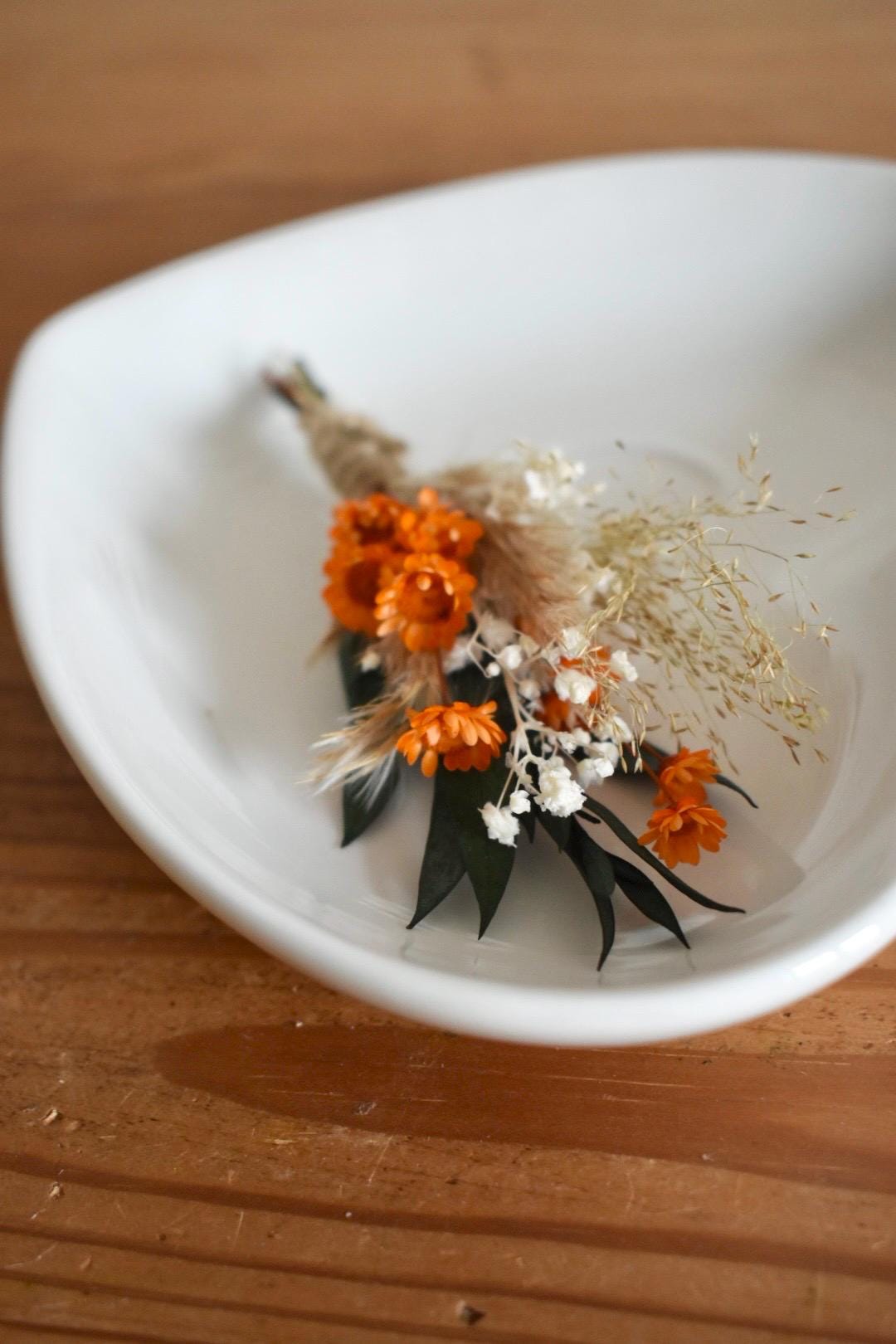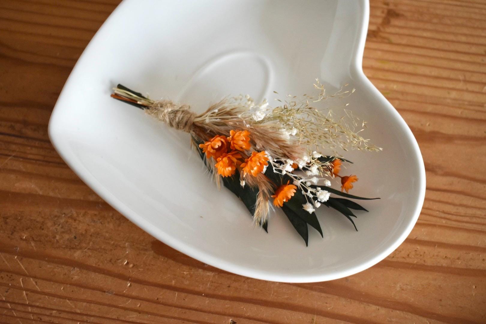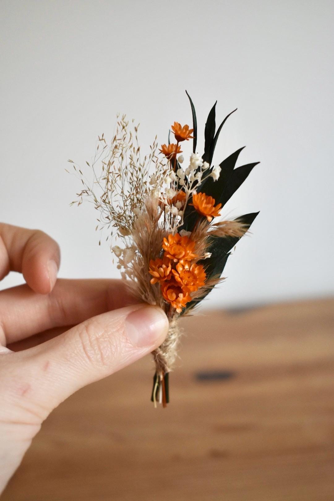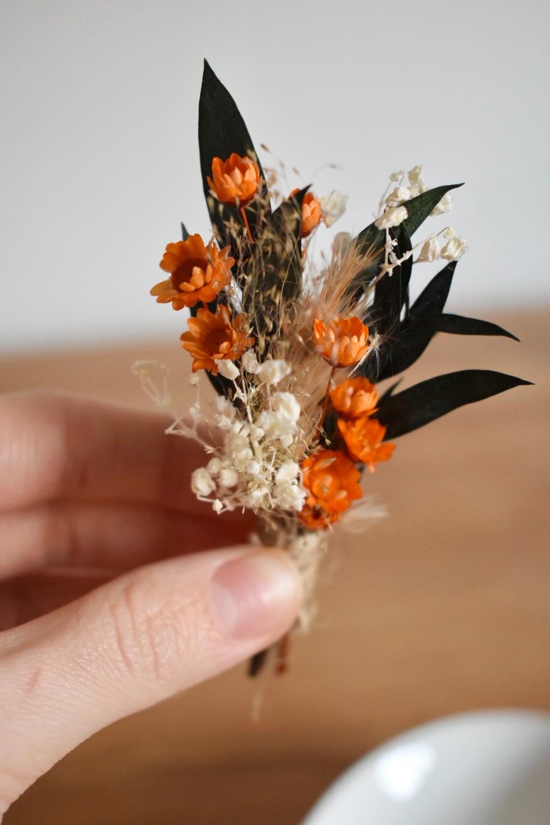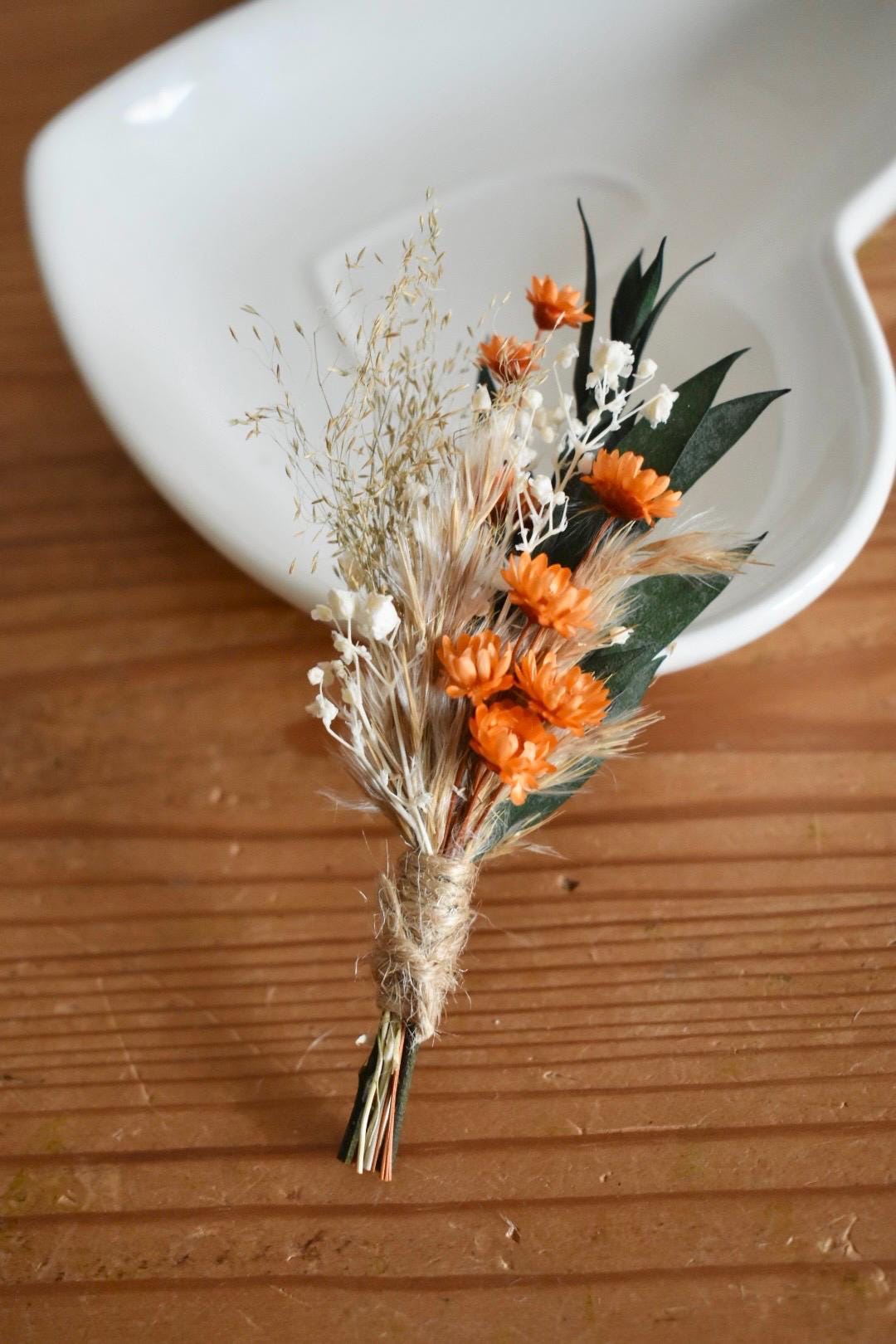 This dried flower buttonhole has been created using preserved eucalyptus, gypsophila dried grasses and orange glixia. The stems are wrapped in twine for a rustic finish and is supplied with a faux pearl-topped pin for easy attachment.