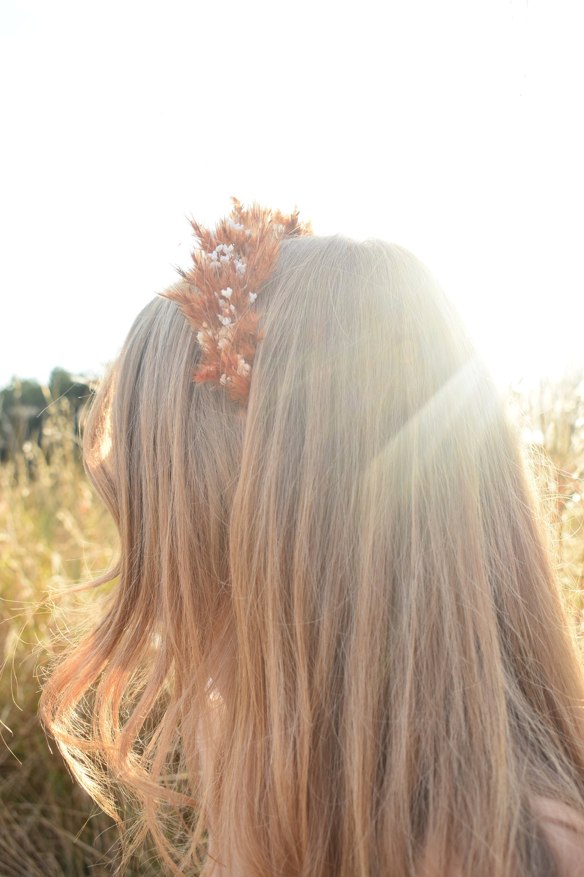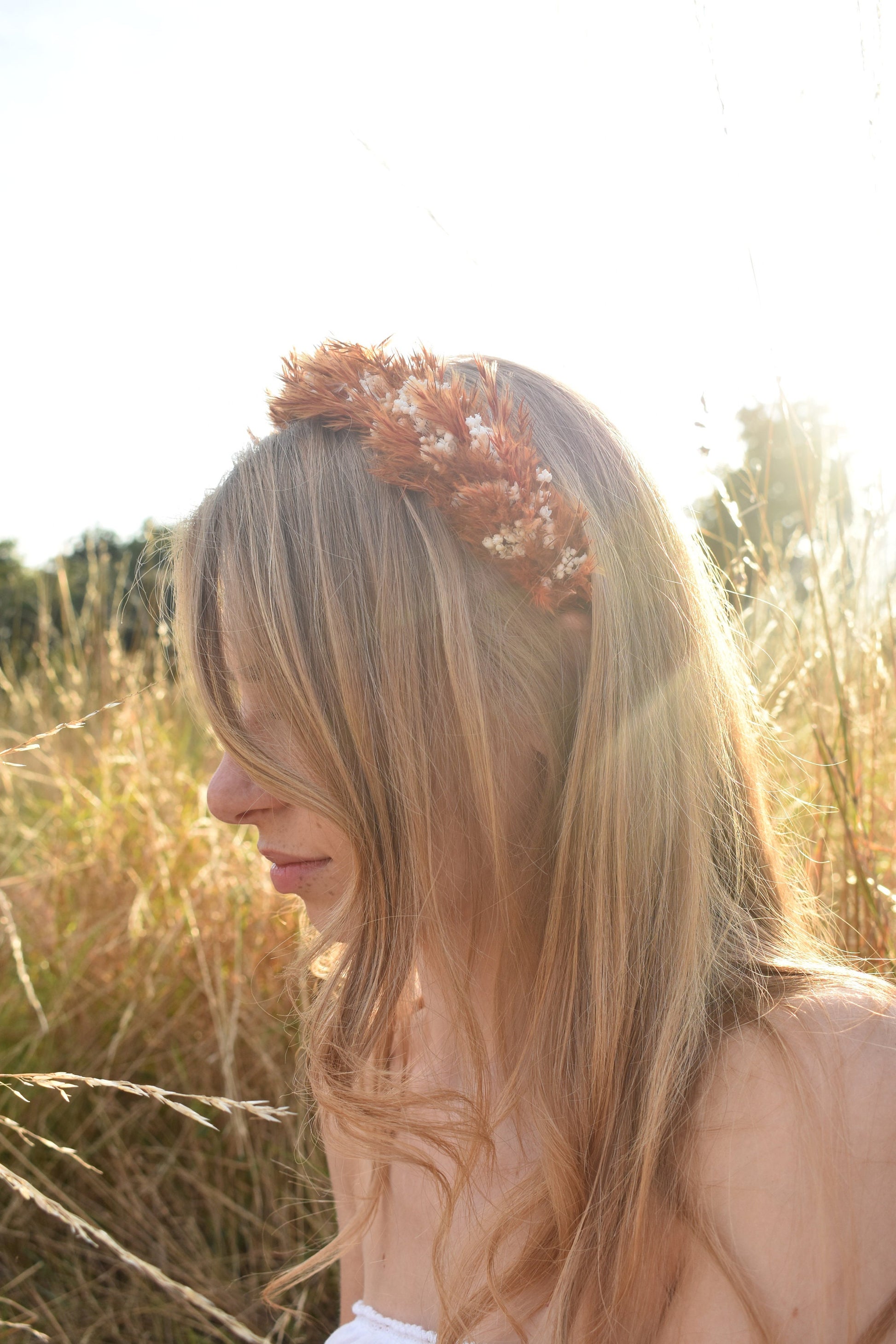 Burnt orange pampas grass and dried marcela attached to a metal silver headband.