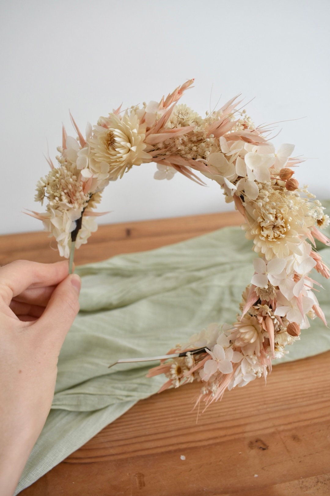 Floral headband with a mix of dried flowers including bleached hydrangea, broom bloom, glixia and peach oats and wheat.