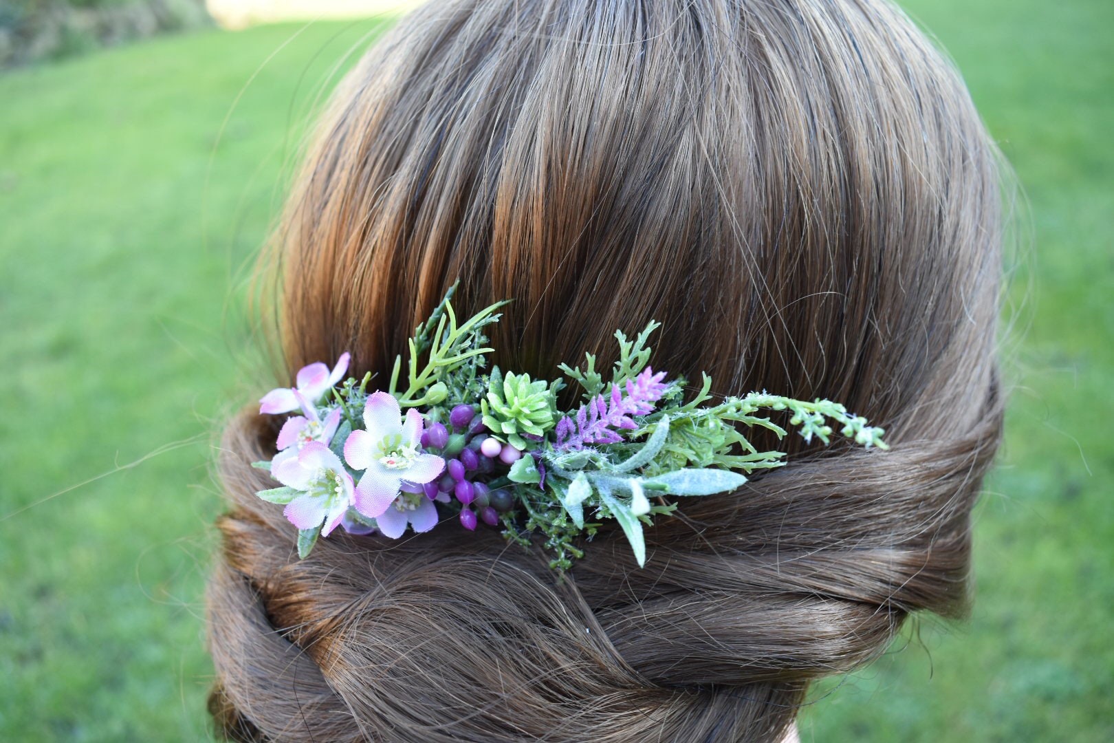 This floral hair piece is an arrangement of small pink flowers, berries and greenery. The flowers sit on a pip vine which is secured to hair pins at either end.