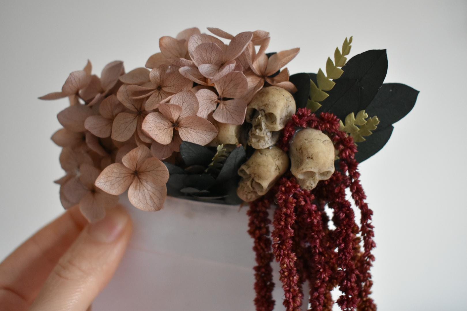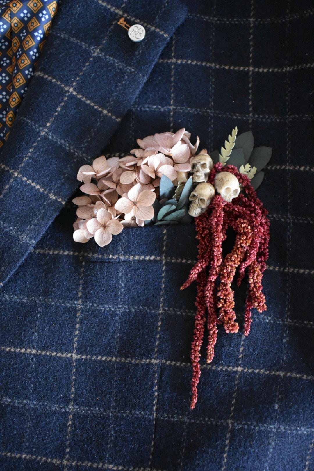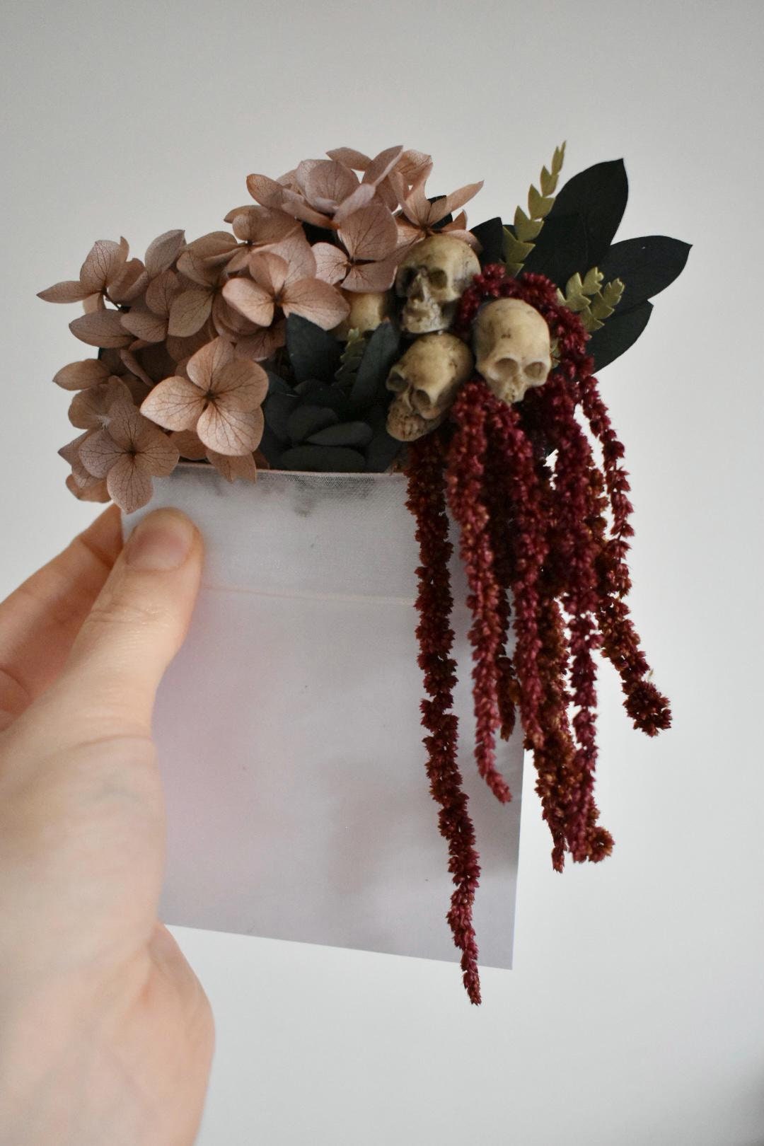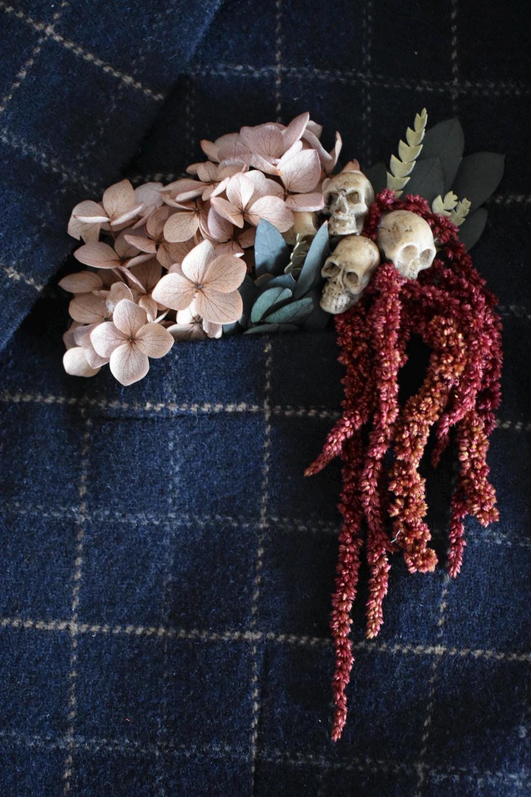 Floral pocket square made with preserved eucalyptus leaves, hydrangea, cascading amaranthus and mini faux skulls. Attached to white card and finished with a white organza ribbon.