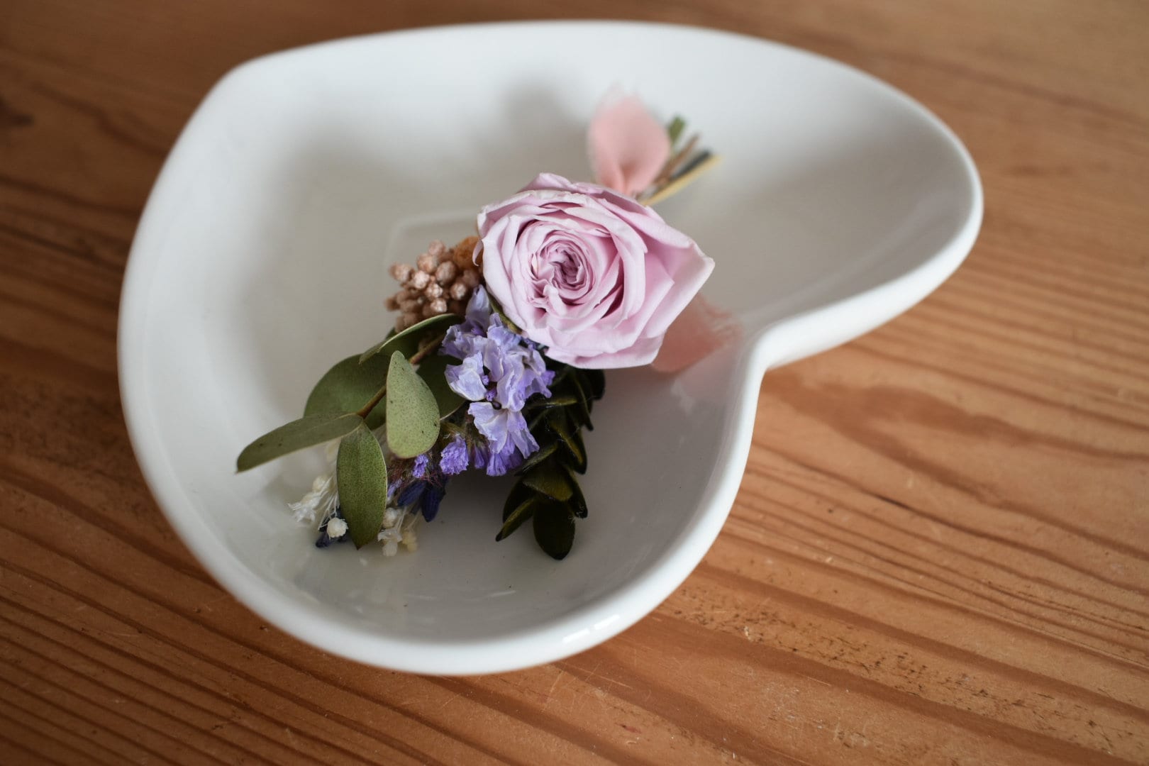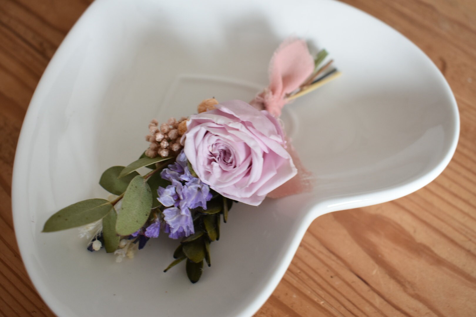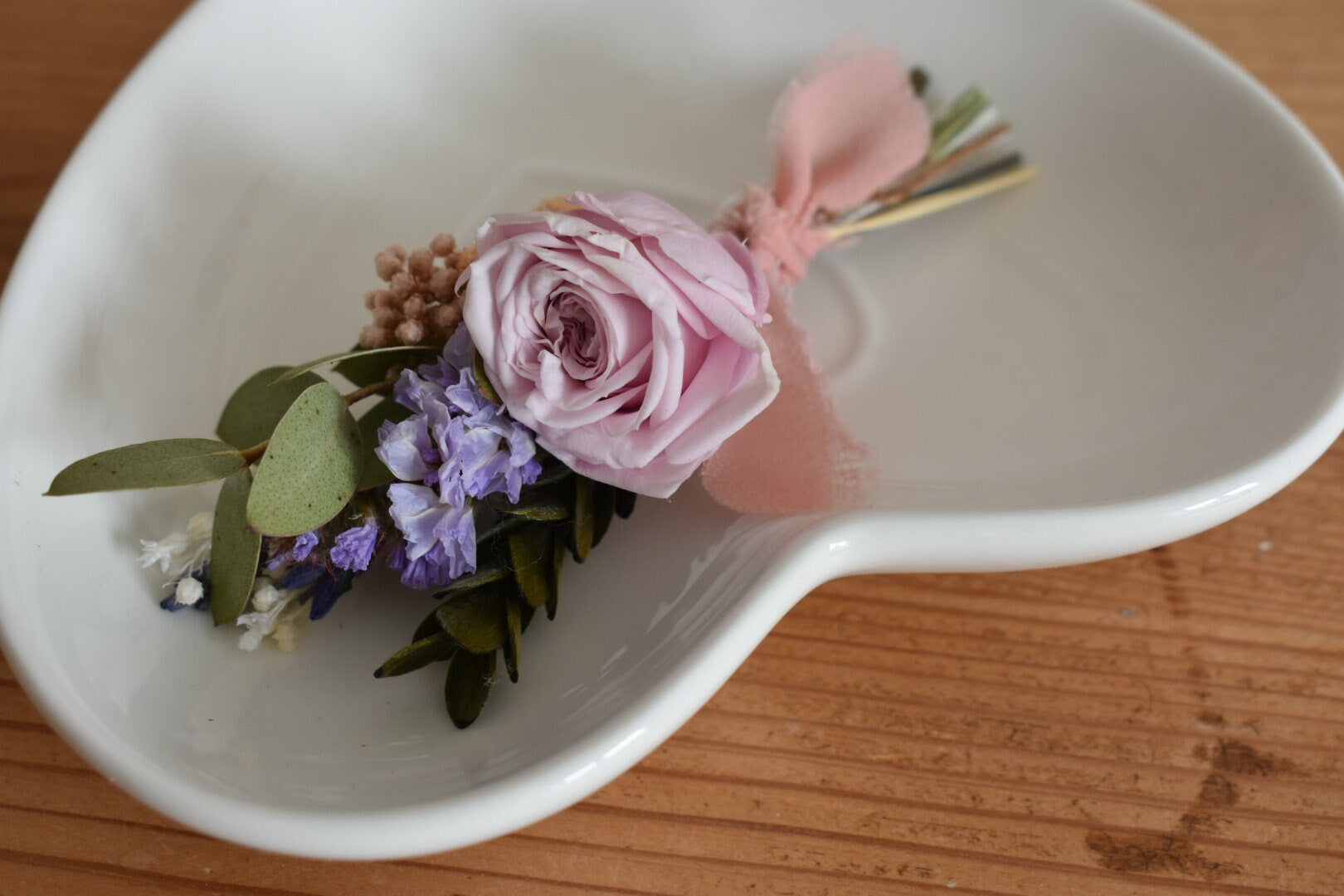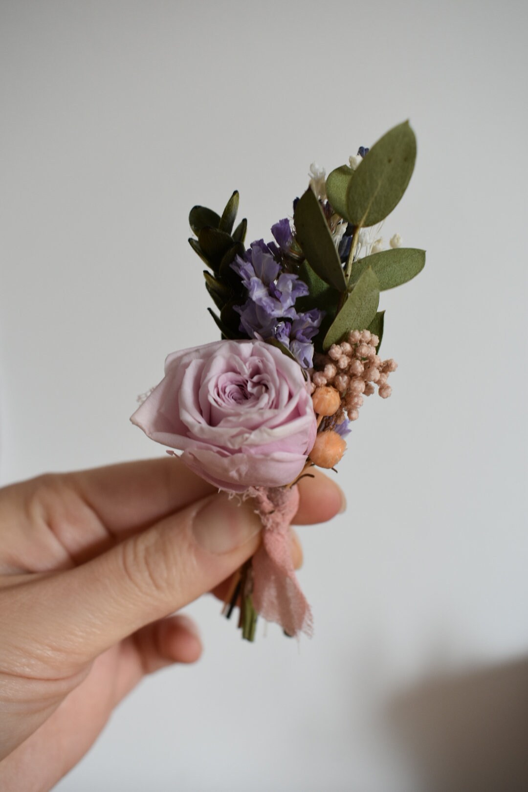 Floral button hole made with a dried spring flowers and a preserved pink rose. Finished with a pink chiffon ribbon and supplied with a pearl top pin.