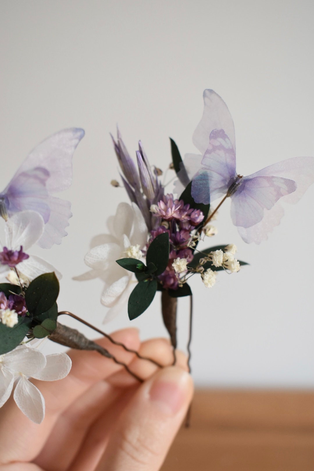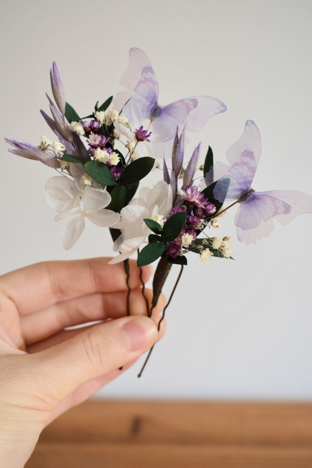 Floral hair pins with organza butterflies, preserved hydrangea, eucalyptus, dried gypsophila and glixia.