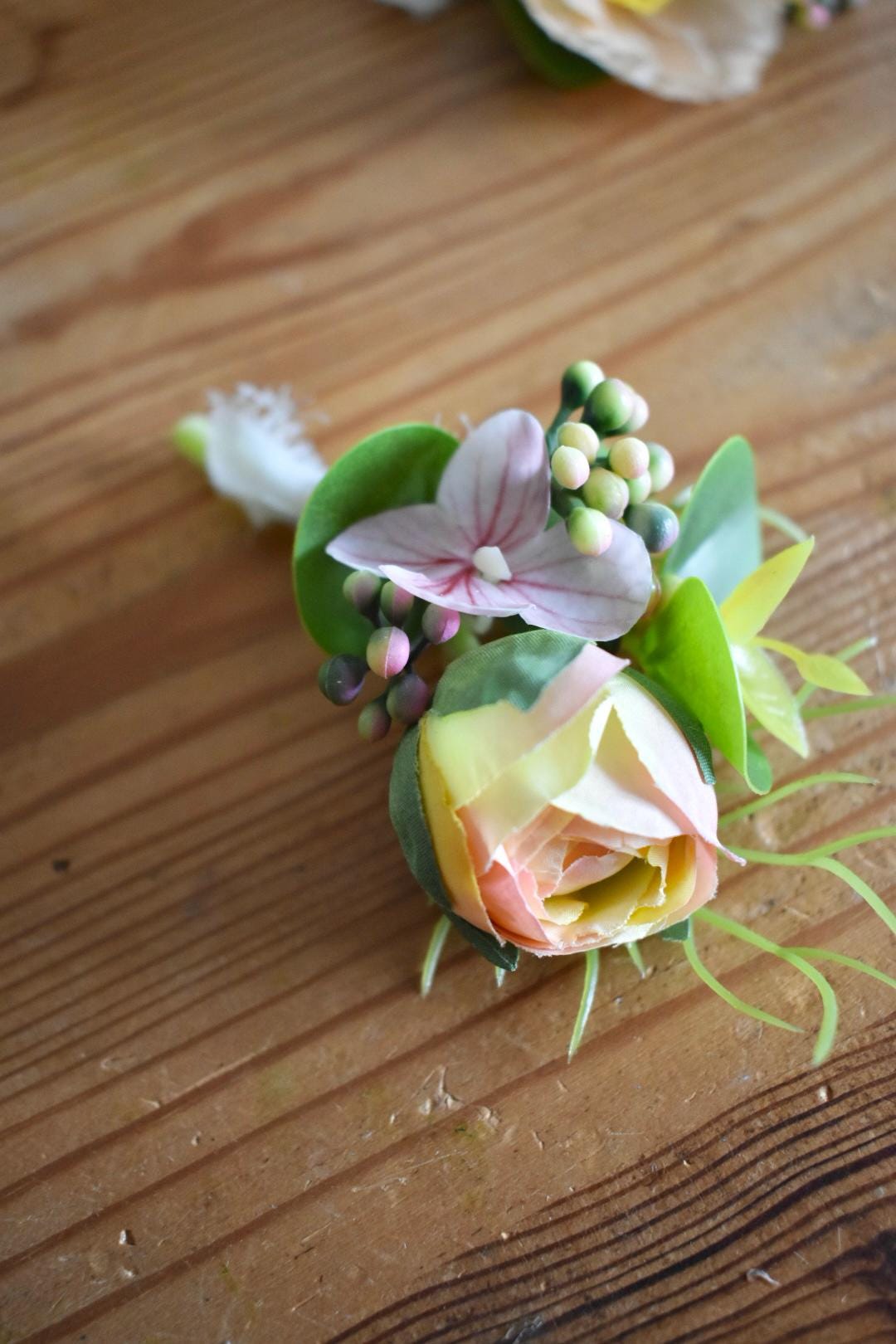 An artificial buttonhole, featuring a delicate ranunculus bud and hydrangea bloom surrounded by soft, complementary foliage. Arranged for a natural look, the stems are wrapped in a white chiffon ribbon, creating a romantic, whimsical finish.