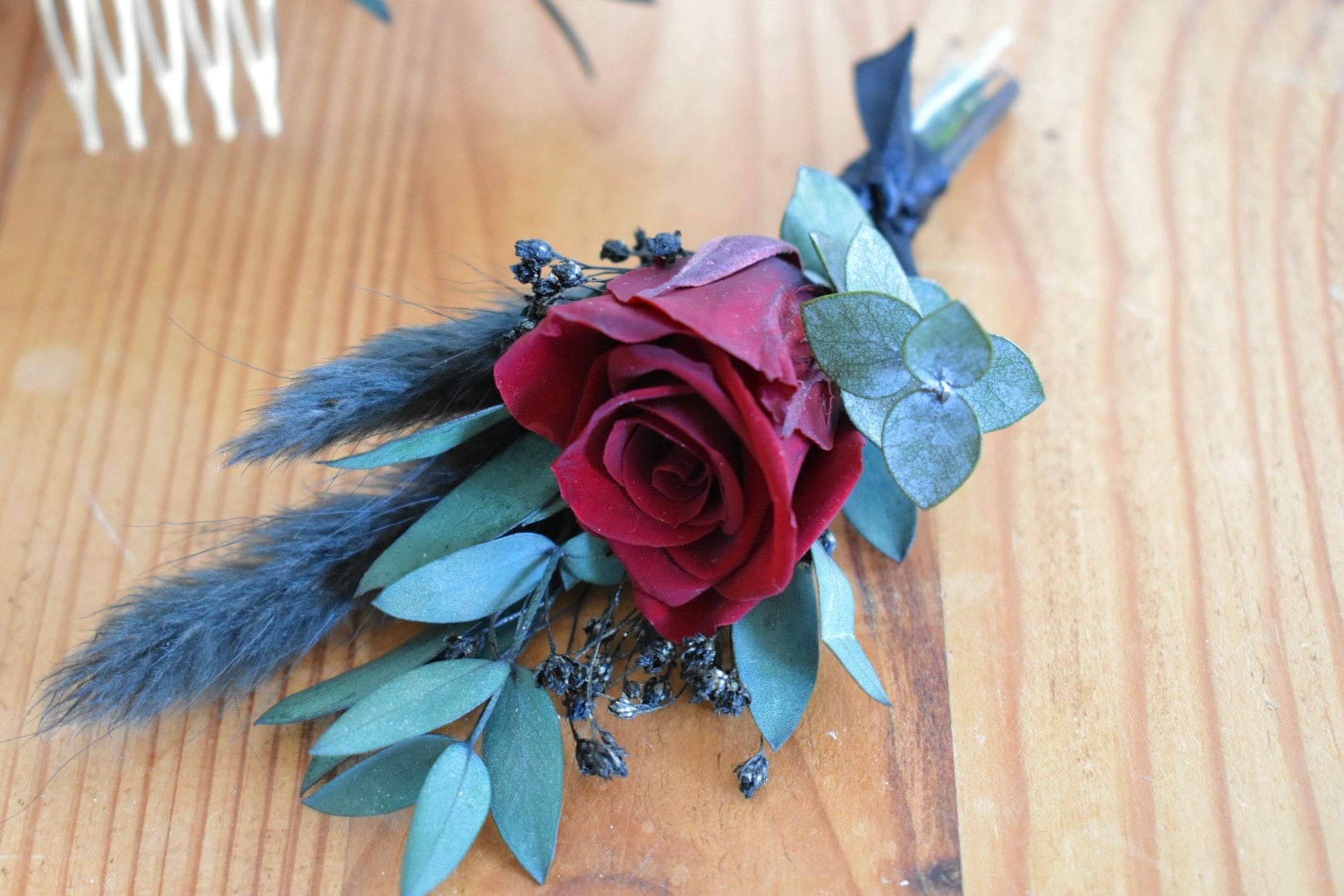 A preserved deep red rose, eucalyptus leaves, dried black broom bloom and bunny tails. Finished with a burgundy organza ribbon and supplied with a pearl top pin.