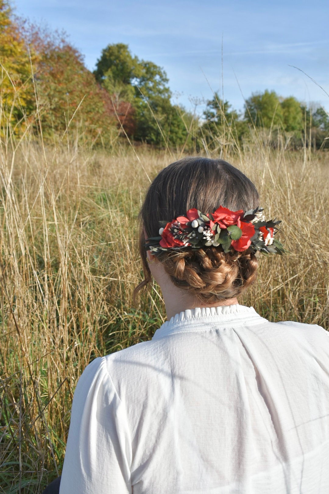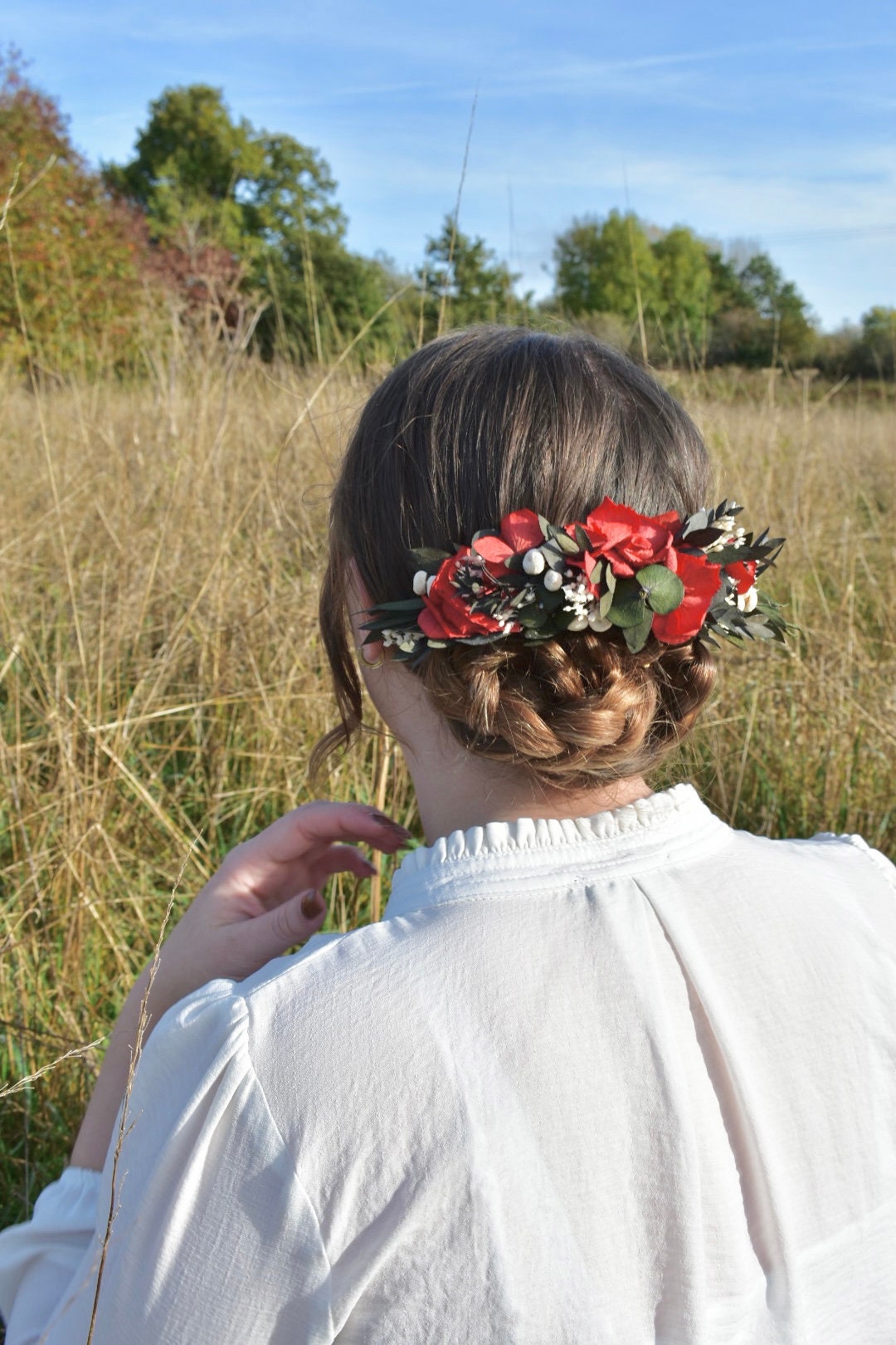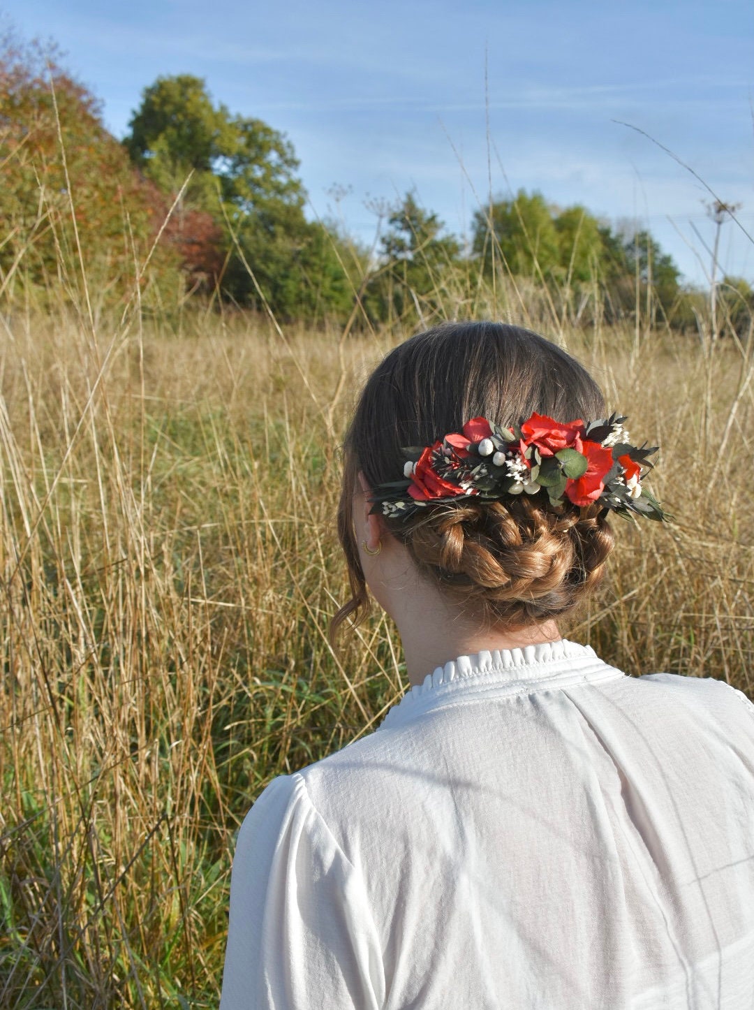 This floral hair piece is an arrangement of preserved and dried flowers including eucalyptus and hydrangea.