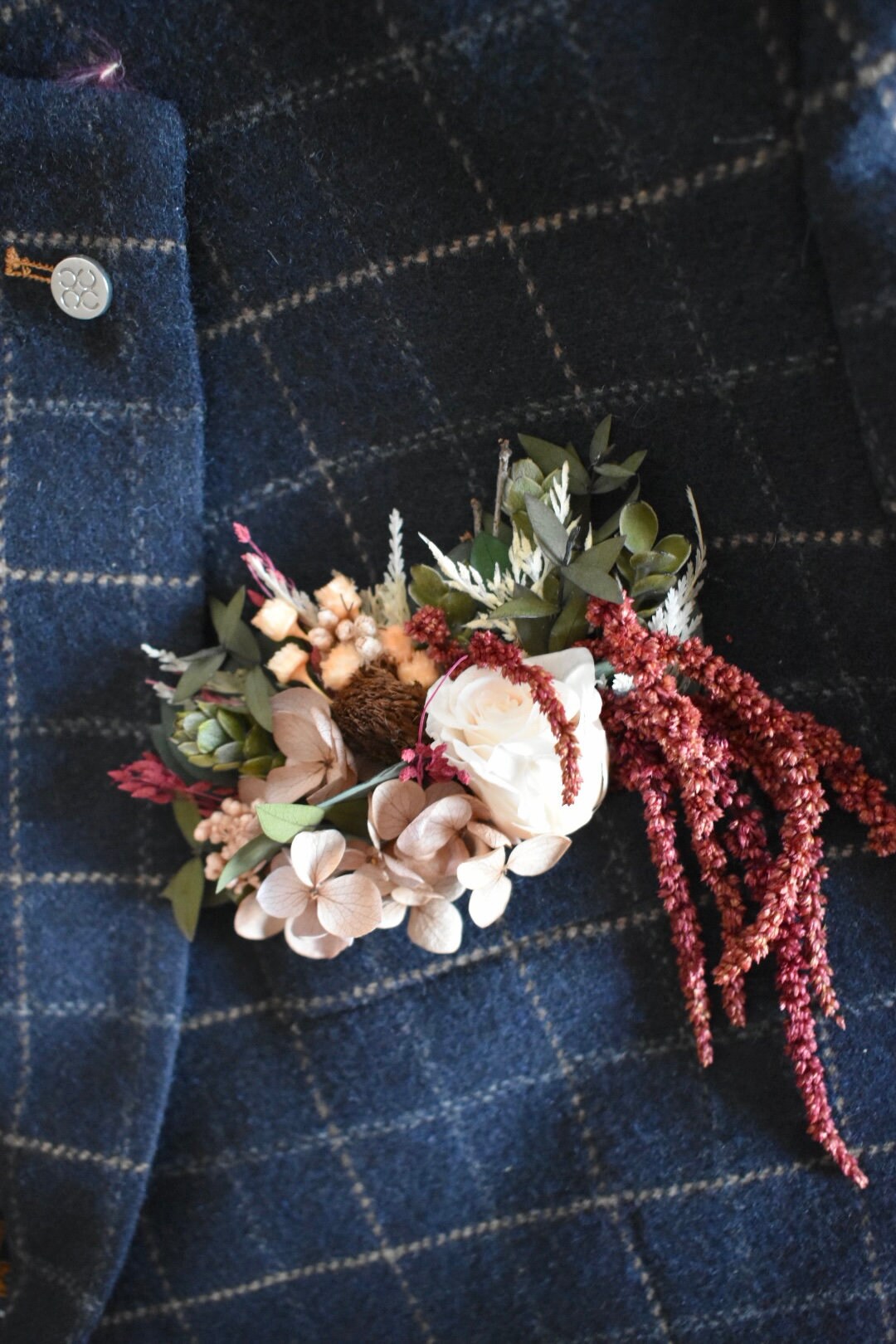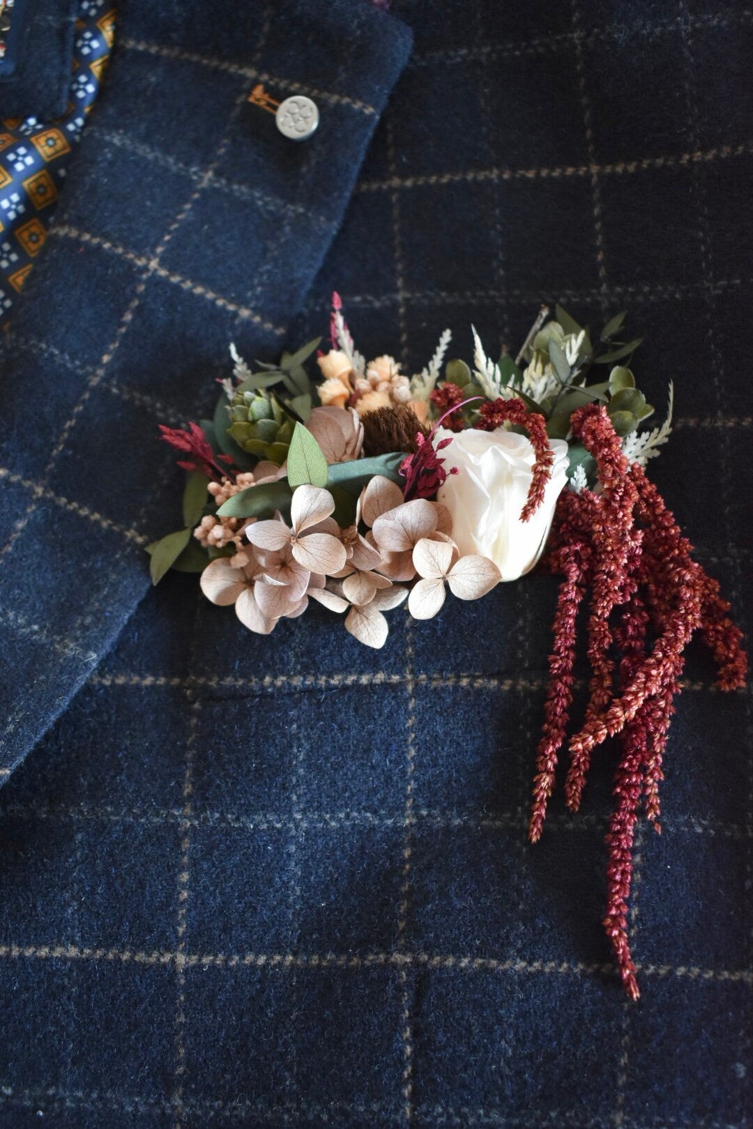 Rose, hydrangea and amaranthus statement pocket boutonniere