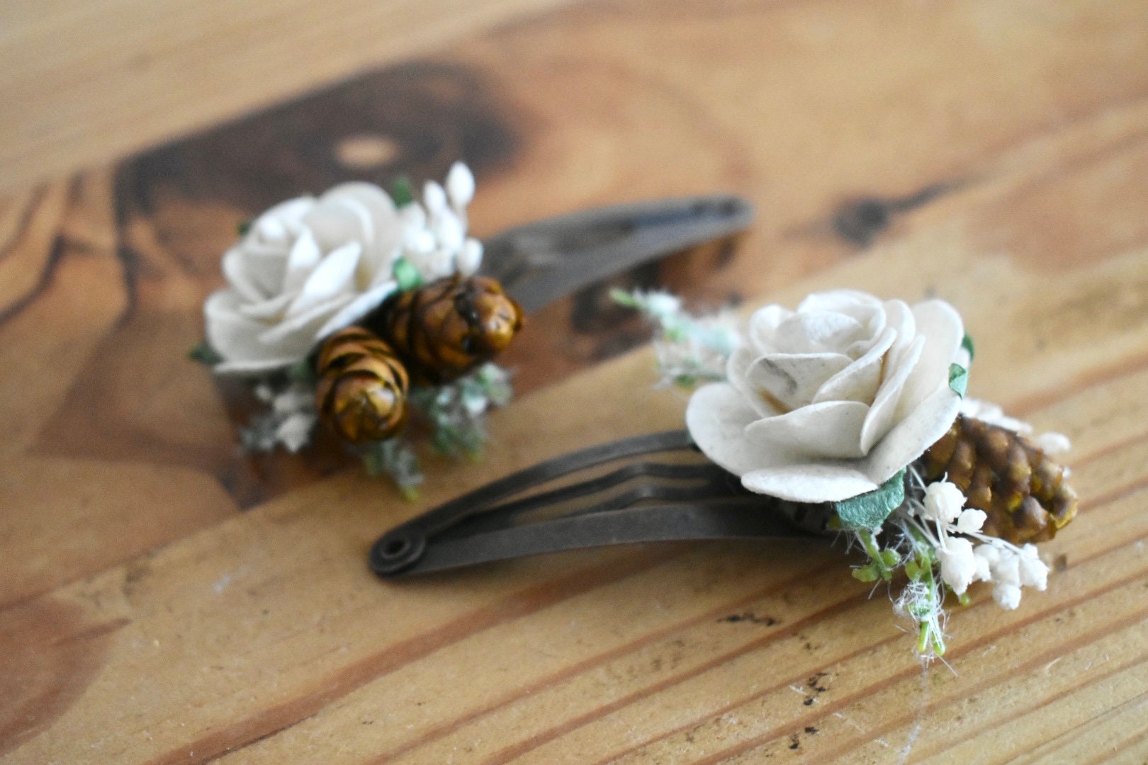 Winter flower hair clips made with paper flowers, berries, greenery and a mini pine cone.